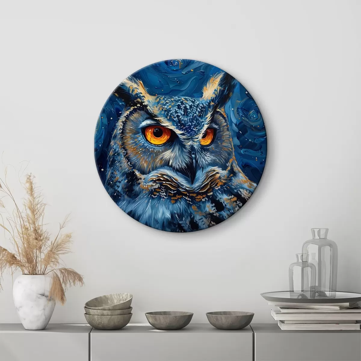 Okrągłe obrazy Nocne spojrzenie sowy na tle nieba w stylu Van Gogha r40982