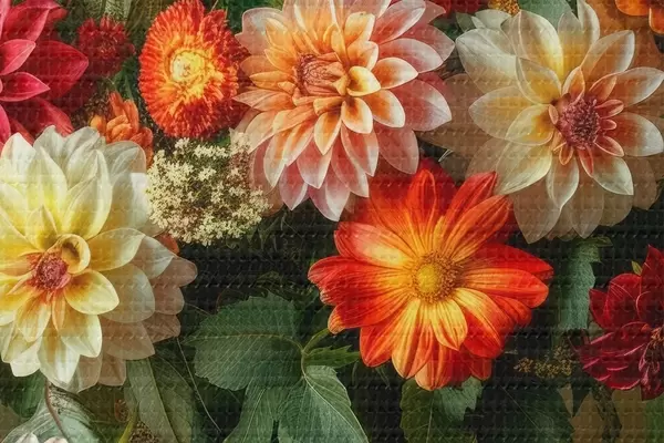 Okrągłe obrazy Bujny bukiet chryzantem w wazonie na tle głębokiej zieleni r41001