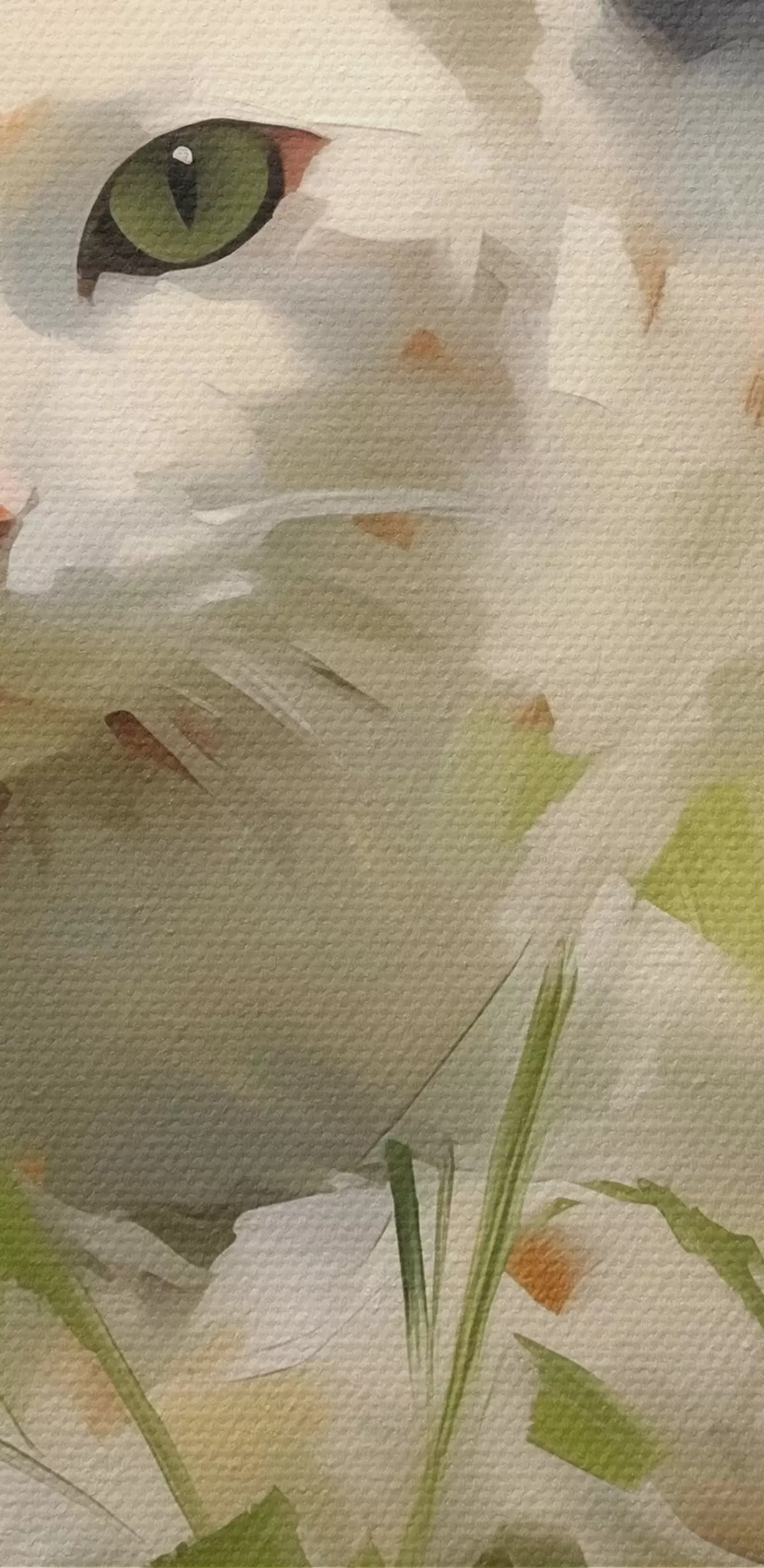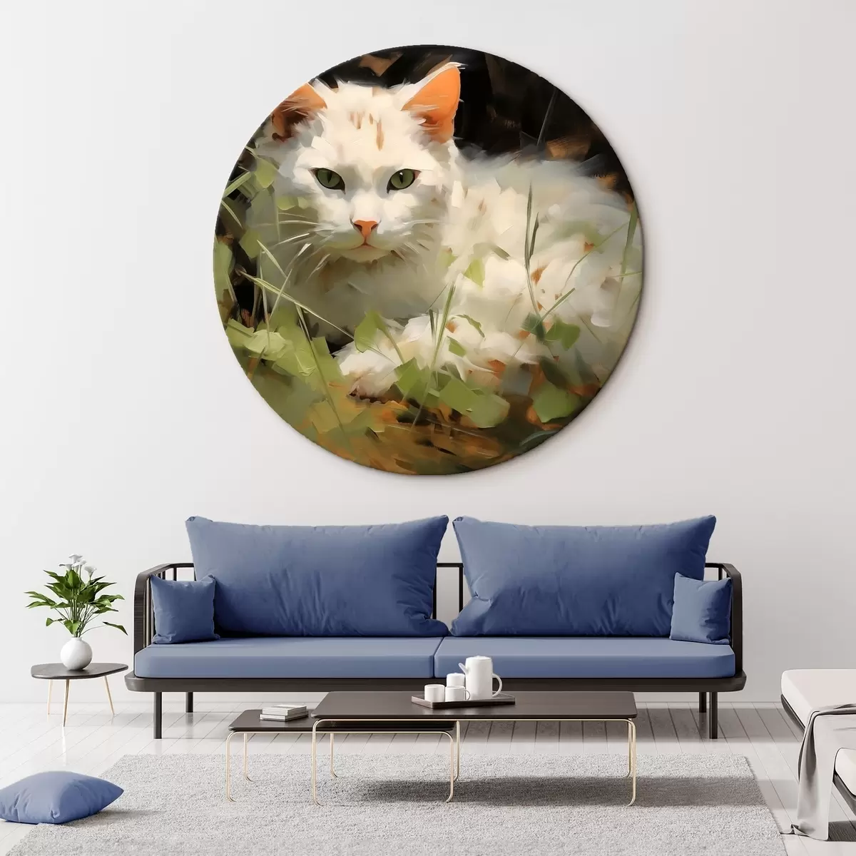 Okrągły obraz Biały kot leżący w trawie, imitacja pociągnięć pędzla Nr r41017