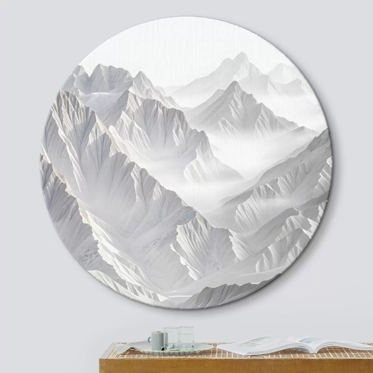 Okrągły obraz Śnieżne minimalistyczne szczyty górskie w mglistym, mglistym krajobrazie Nr r41083