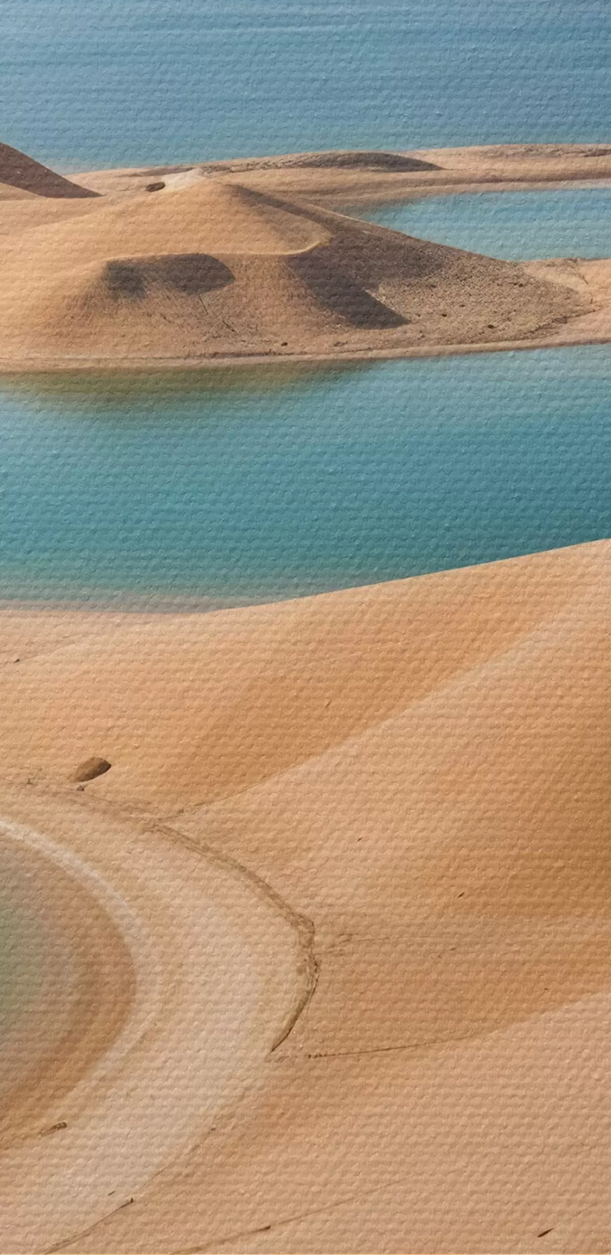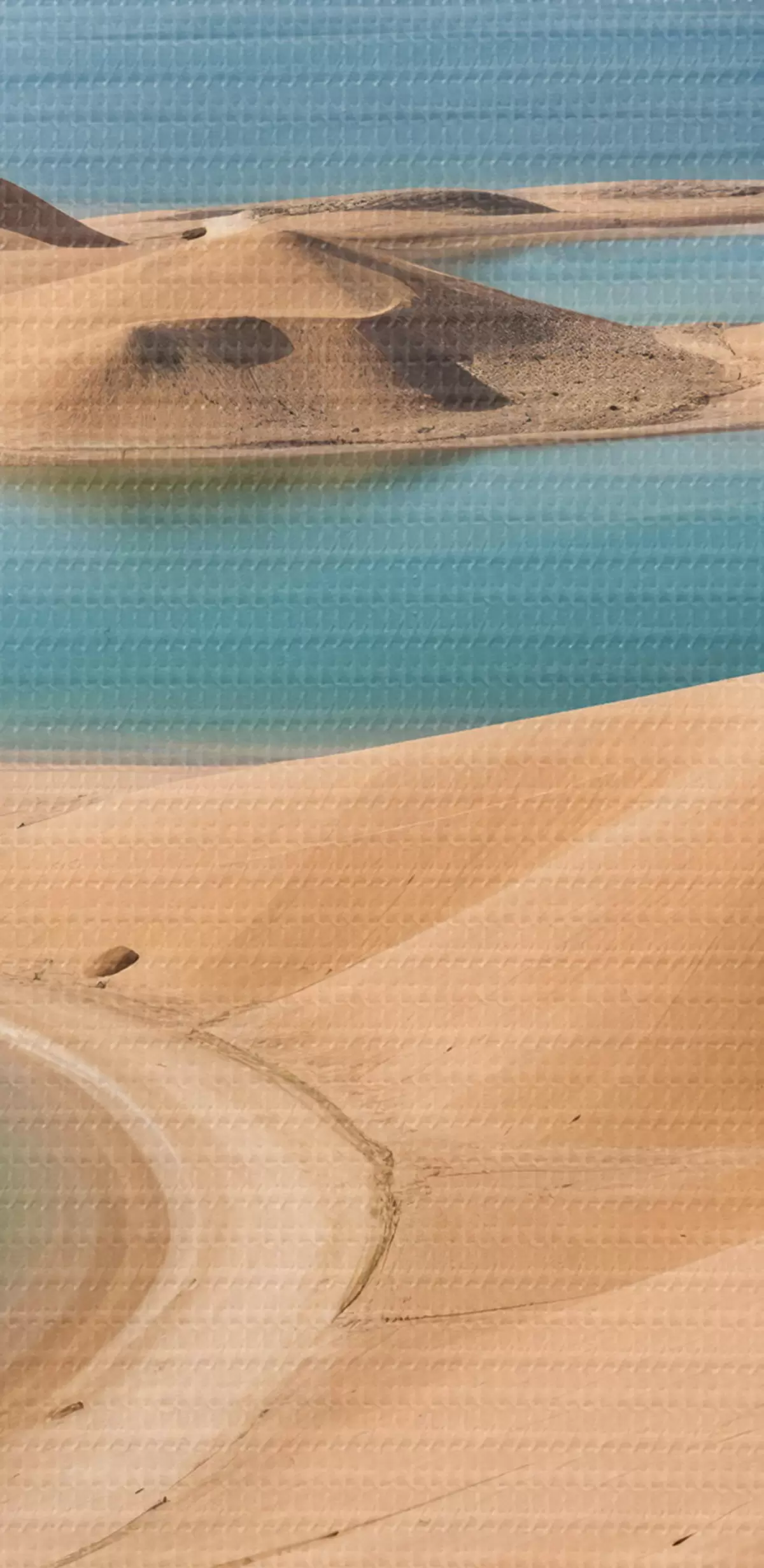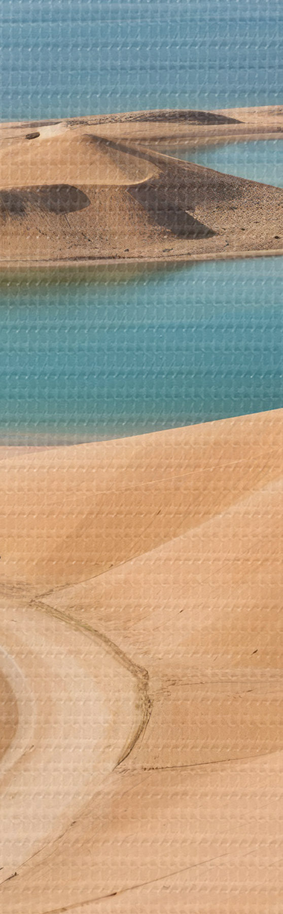 Okrągły obraz Rozległy pustynny krajobraz z falującymi wydmami i turkusowymi jeziorami, otoczony surowymi górami Nr r41087