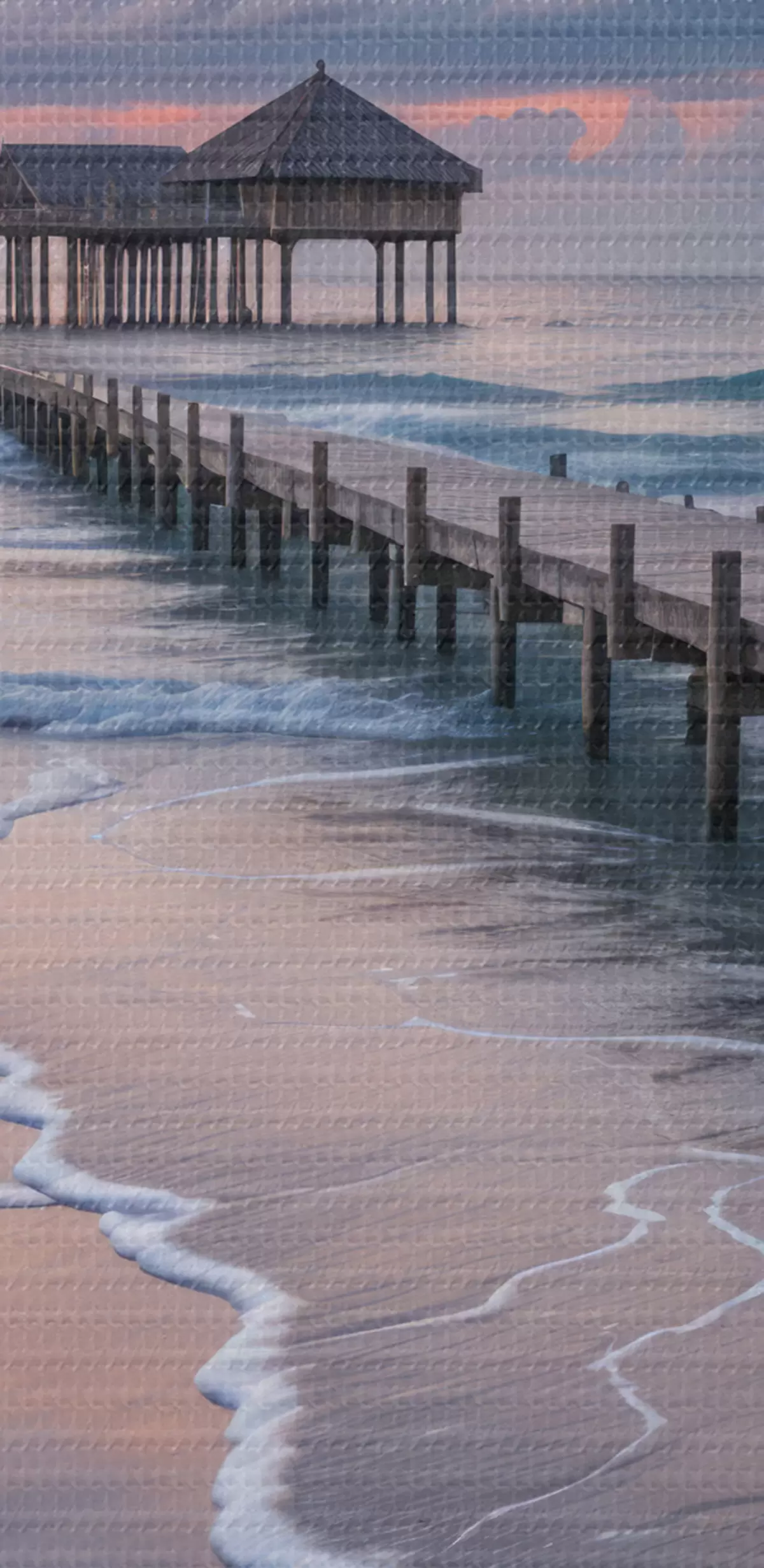 Okrągłe obrazy Drewniane molo z widokiem na spokojny ocean o zachodzie słońca z kolorowymi chmurami r41091