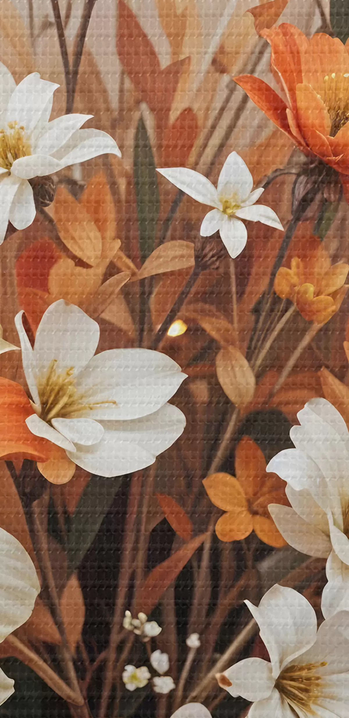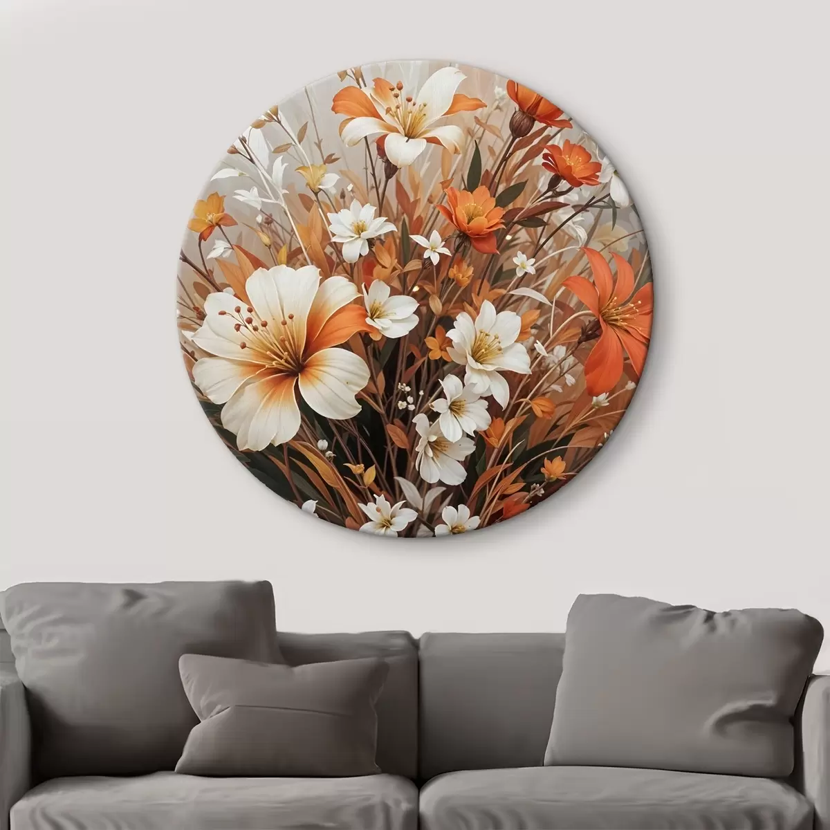Okrągły obraz Żywy bukiet pomarańczowych i białych kwiatów, w tym lilii i innych delikatnych kwiatów Nr r41099