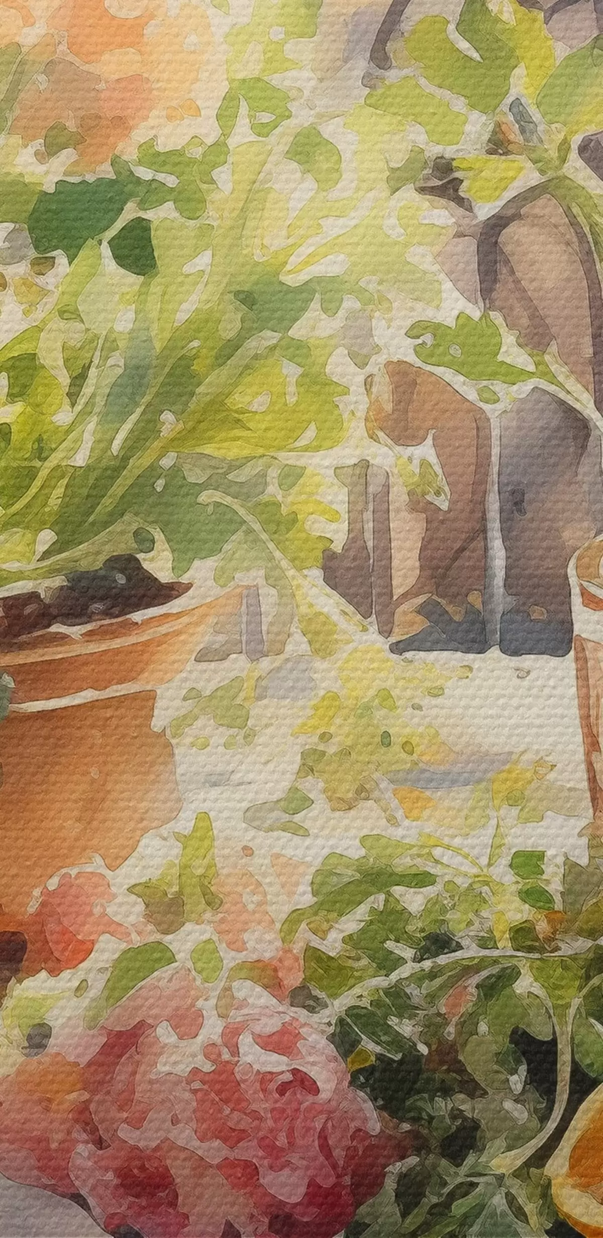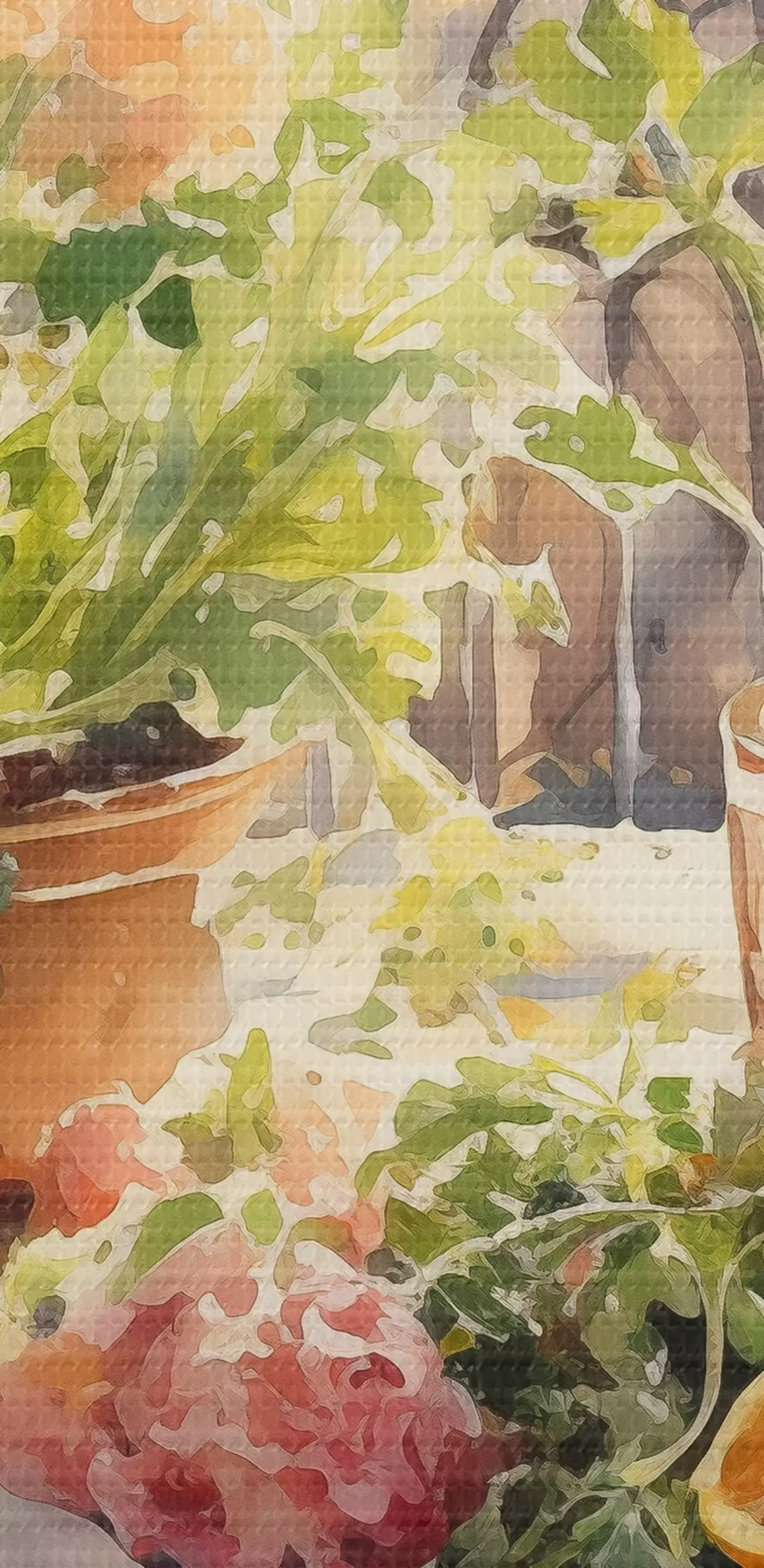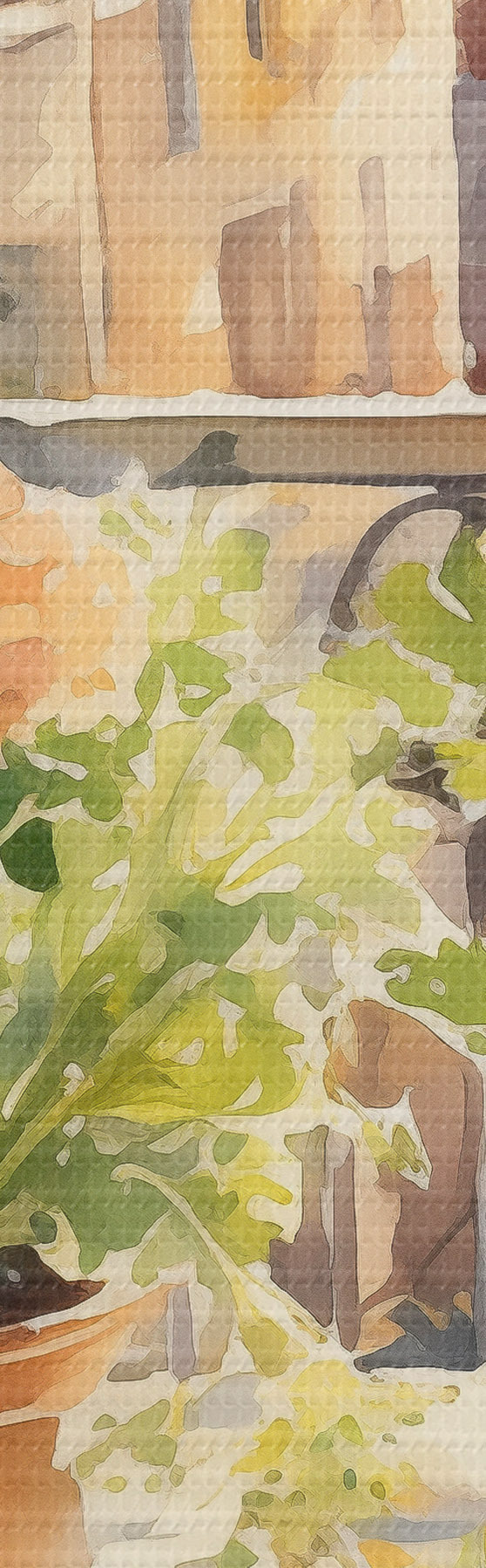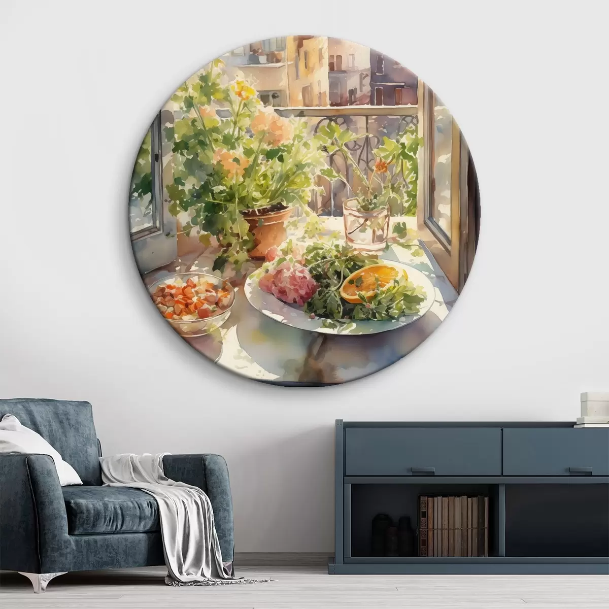 Okrągły obraz Akwarela kolacja, widok na miasto, kwiaty, natura, zielona sałatka Nr r41166