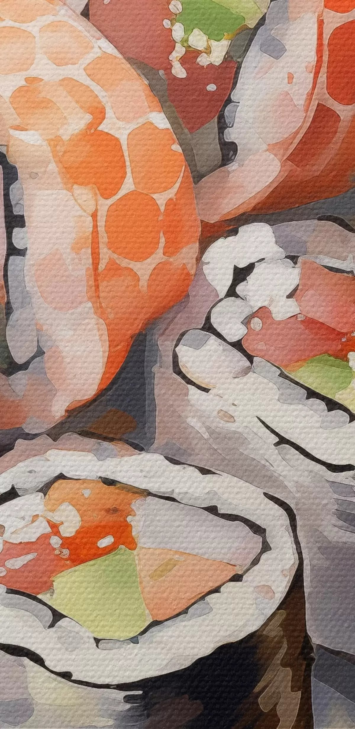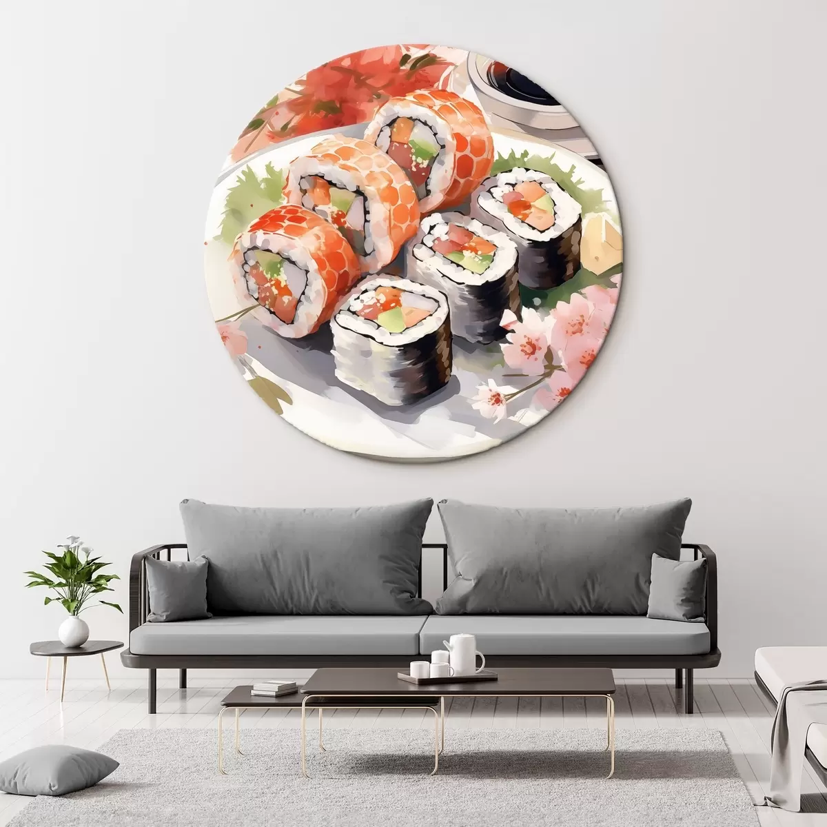 Okrągły obraz Sushi na talerzu, akwarela, kwiatowy, japoński Nr r41179
