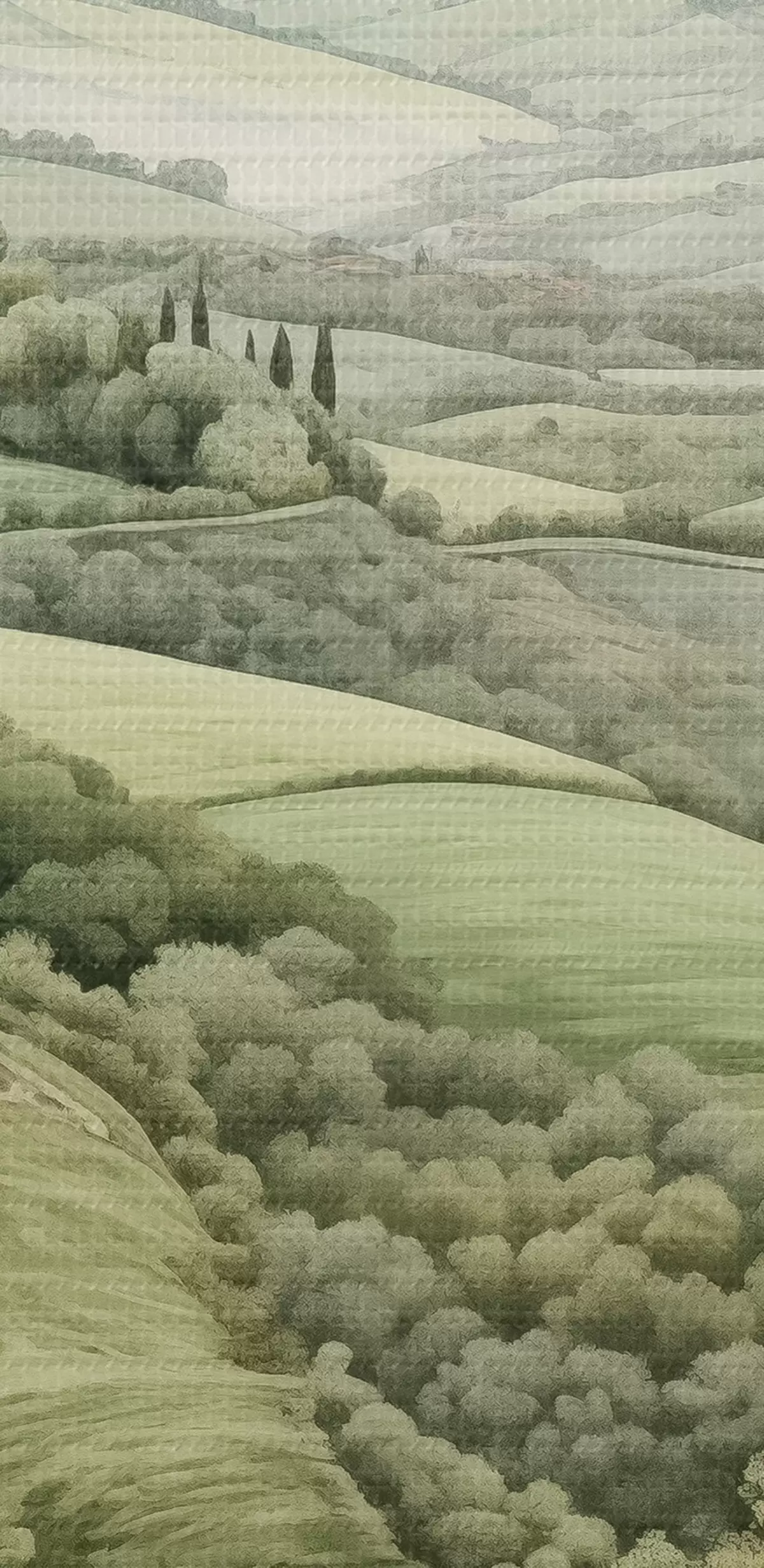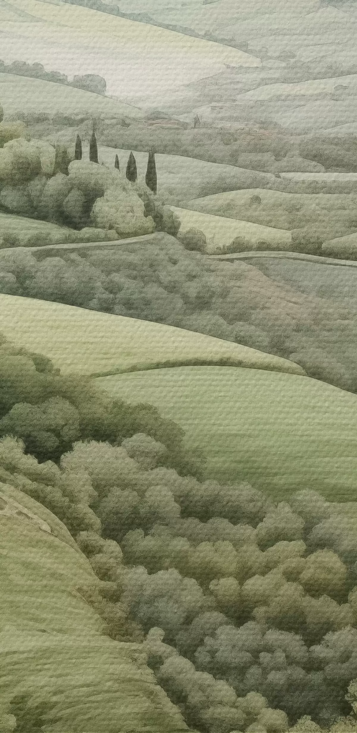 Okrągły obraz Akwarelowe krajobrazy z drzewami i górami, Toscana, lato Nr r41222