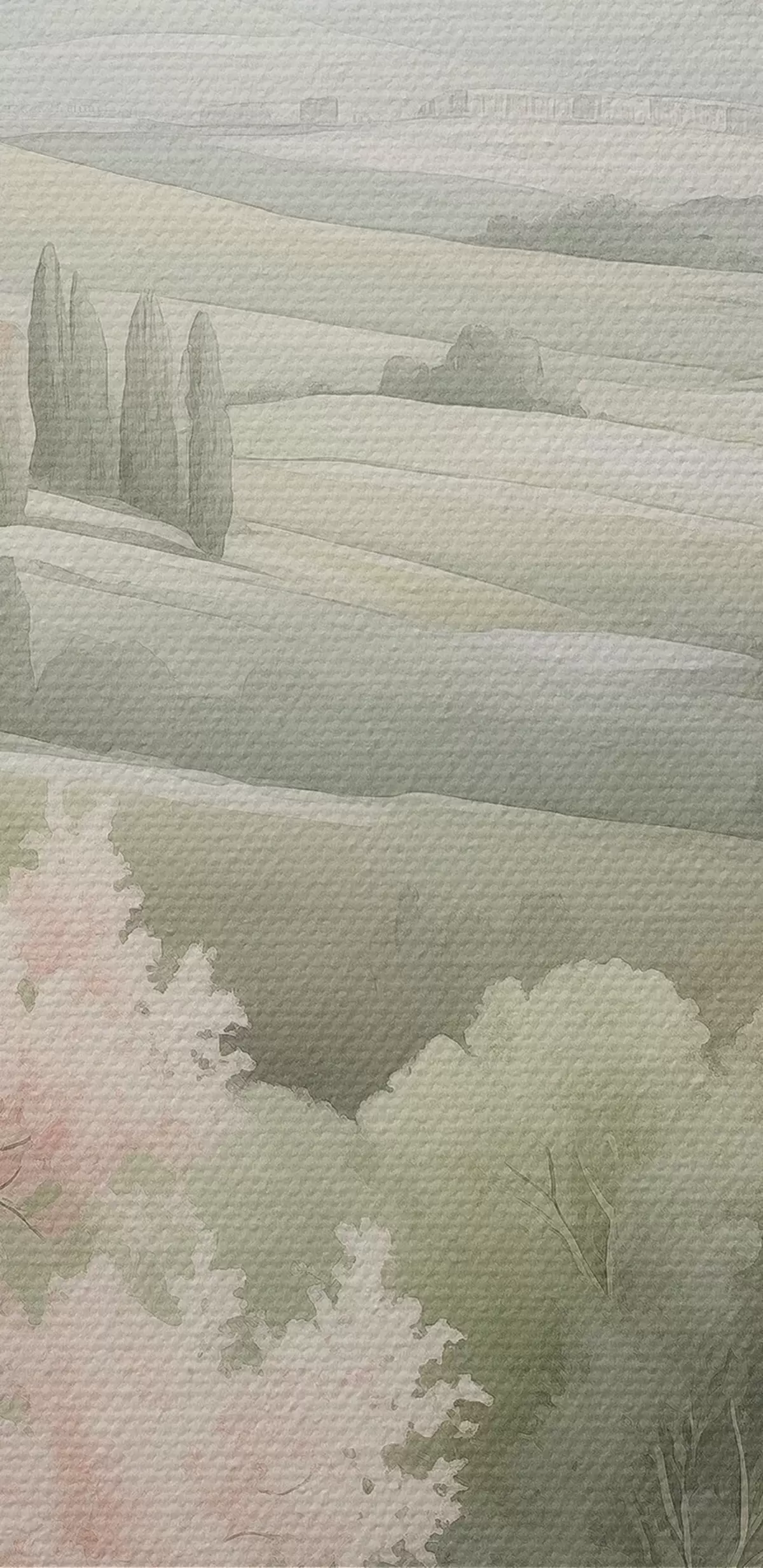 Okrągły obraz Akwarela natura, delikatne kolory, róże, drzewa, zielone wzgórza Nr r41223