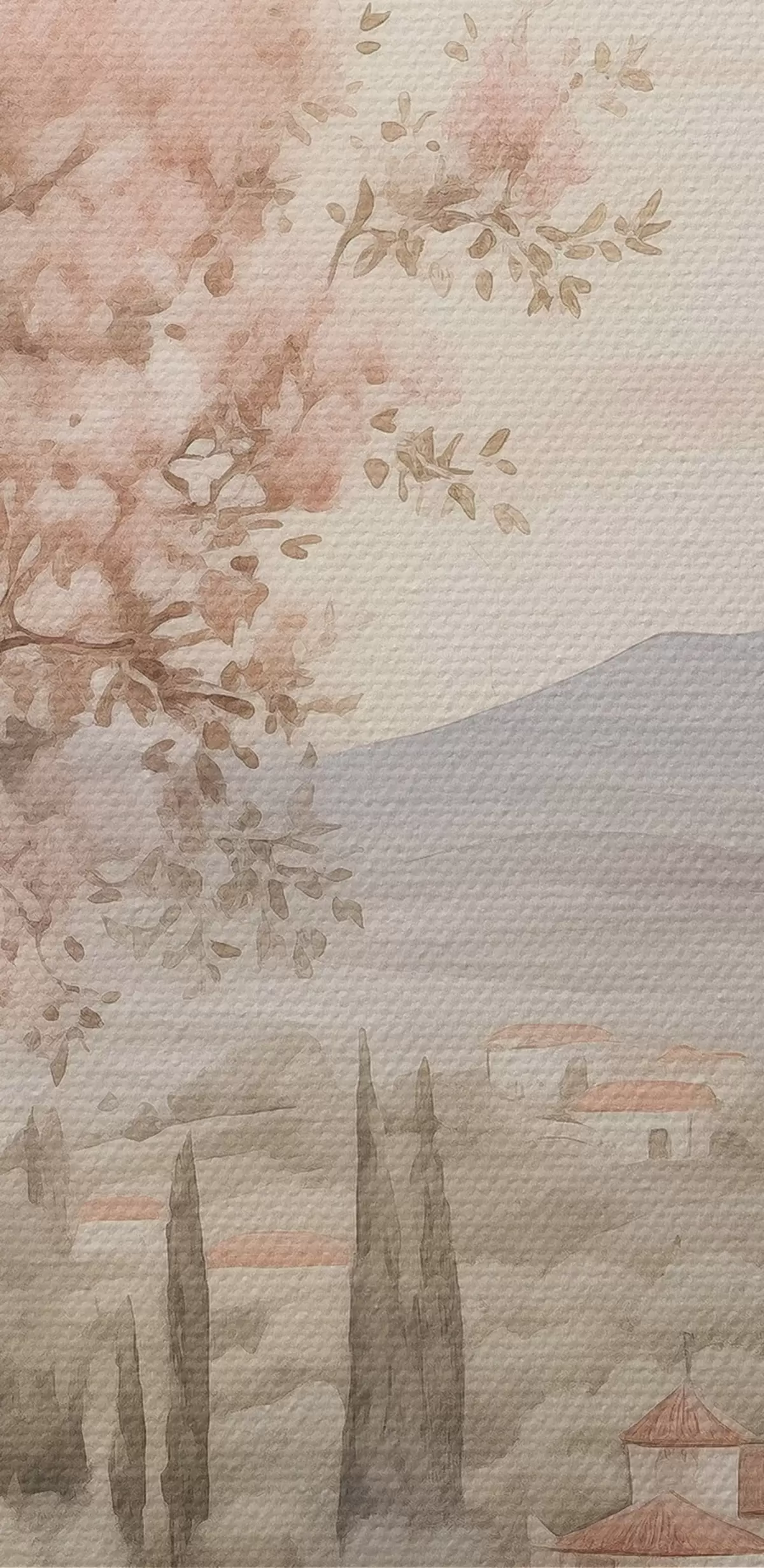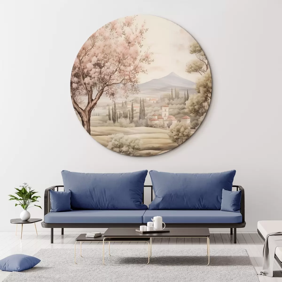 Okrągły obraz Akwarelowe wzgórza, kwiaty wiśni, zamek, styl rustykalny Nr r41225