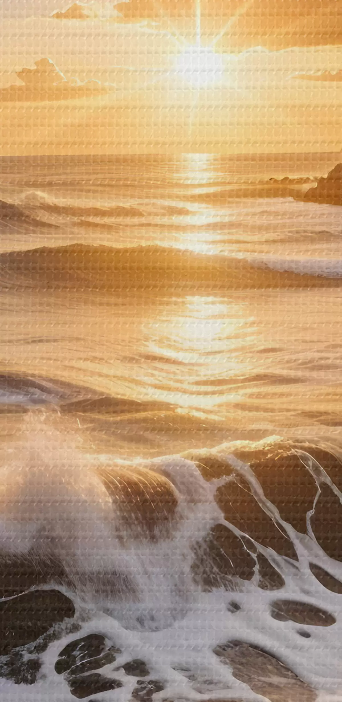 Okrągły obraz Dramatyczny zachód słońca nad skalistym wybrzeżem, z rozbijającymi się falami i dramatycznymi chmurami na niebie Nr r41245