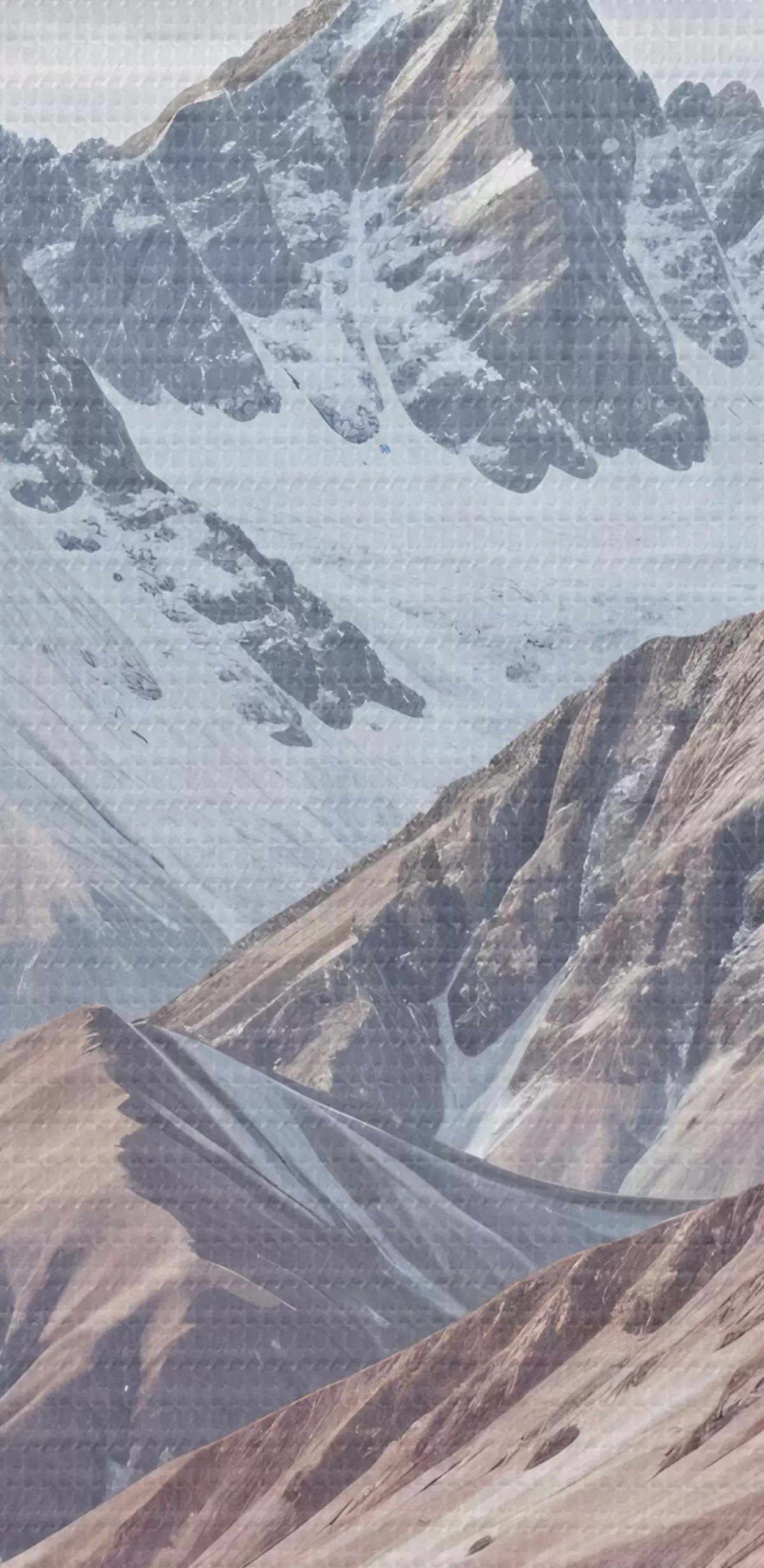 Okrągły obraz Surowe, ośnieżone góry z krętą rzeką płynącą przez rozległy, kolorowy krajobraz Nr r41262