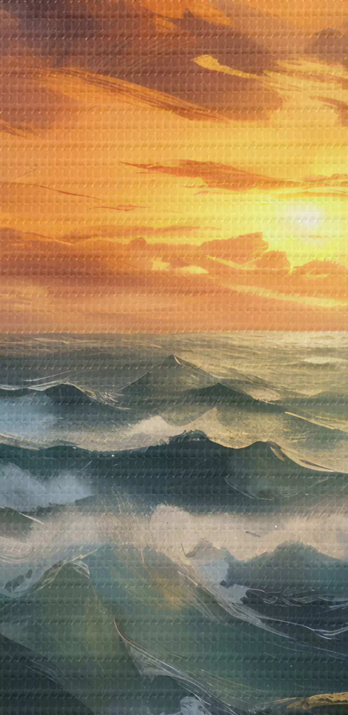 Okrągły obraz Dramatyczny krajobraz morski z rozbijającymi się falami i skalistymi klifami na tle pomarańczowo-żółtego nieba z chmurami Nr r41266