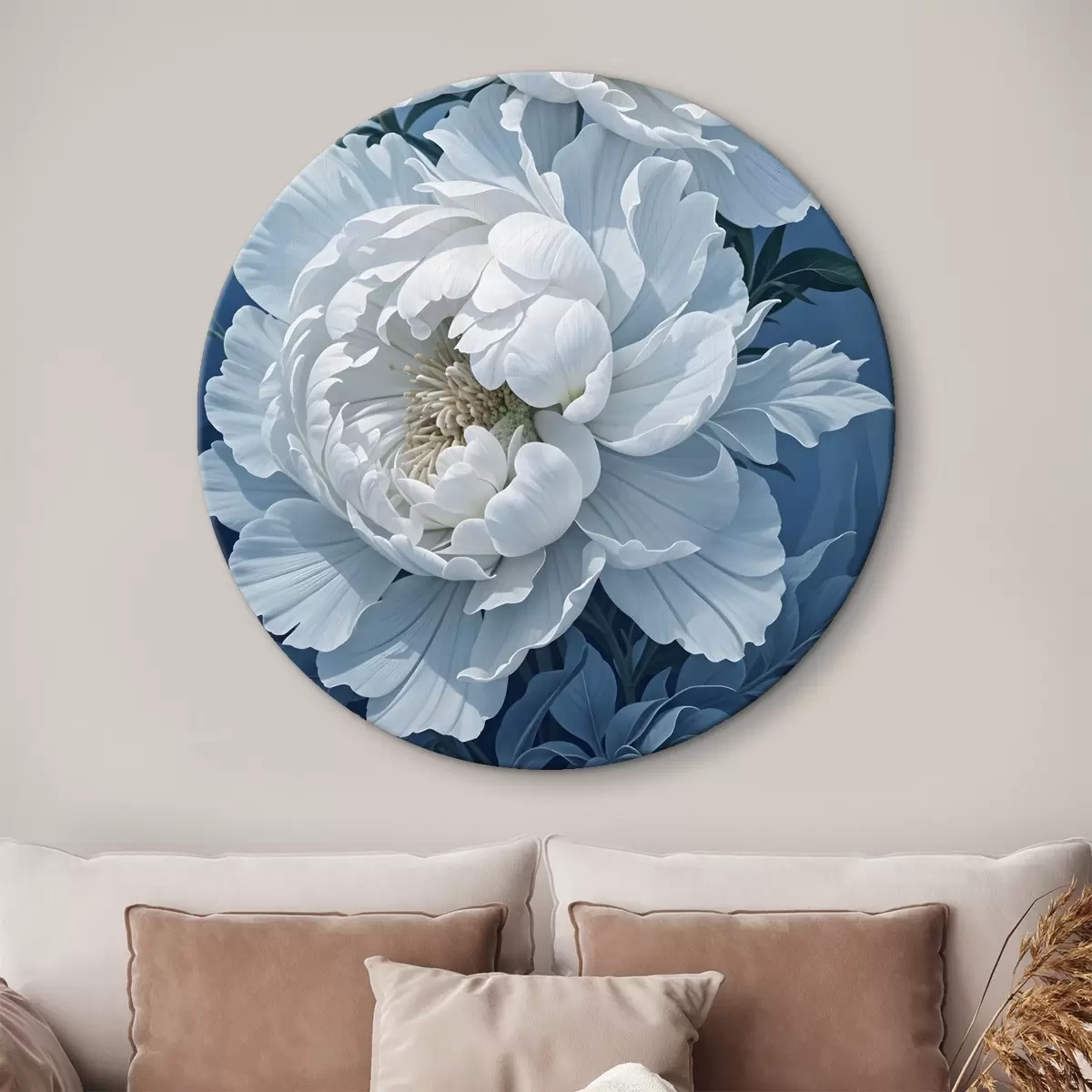 Okrągły obraz Białe piwonie z zielonymi liśćmi na ciemnoniebieskim tle Nr r41270