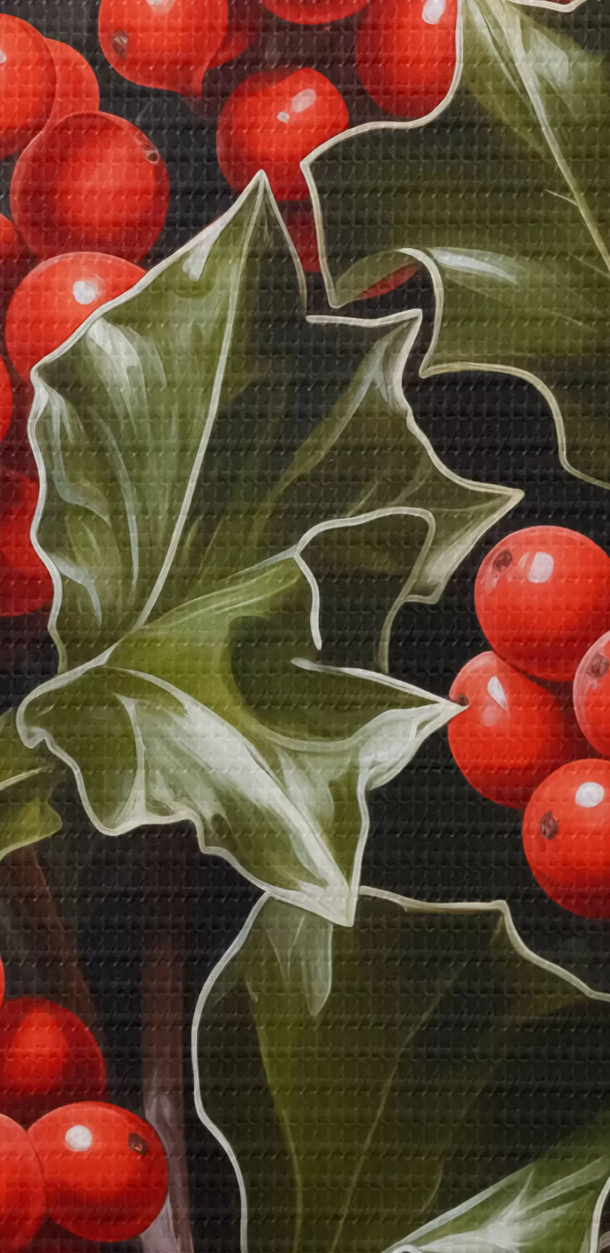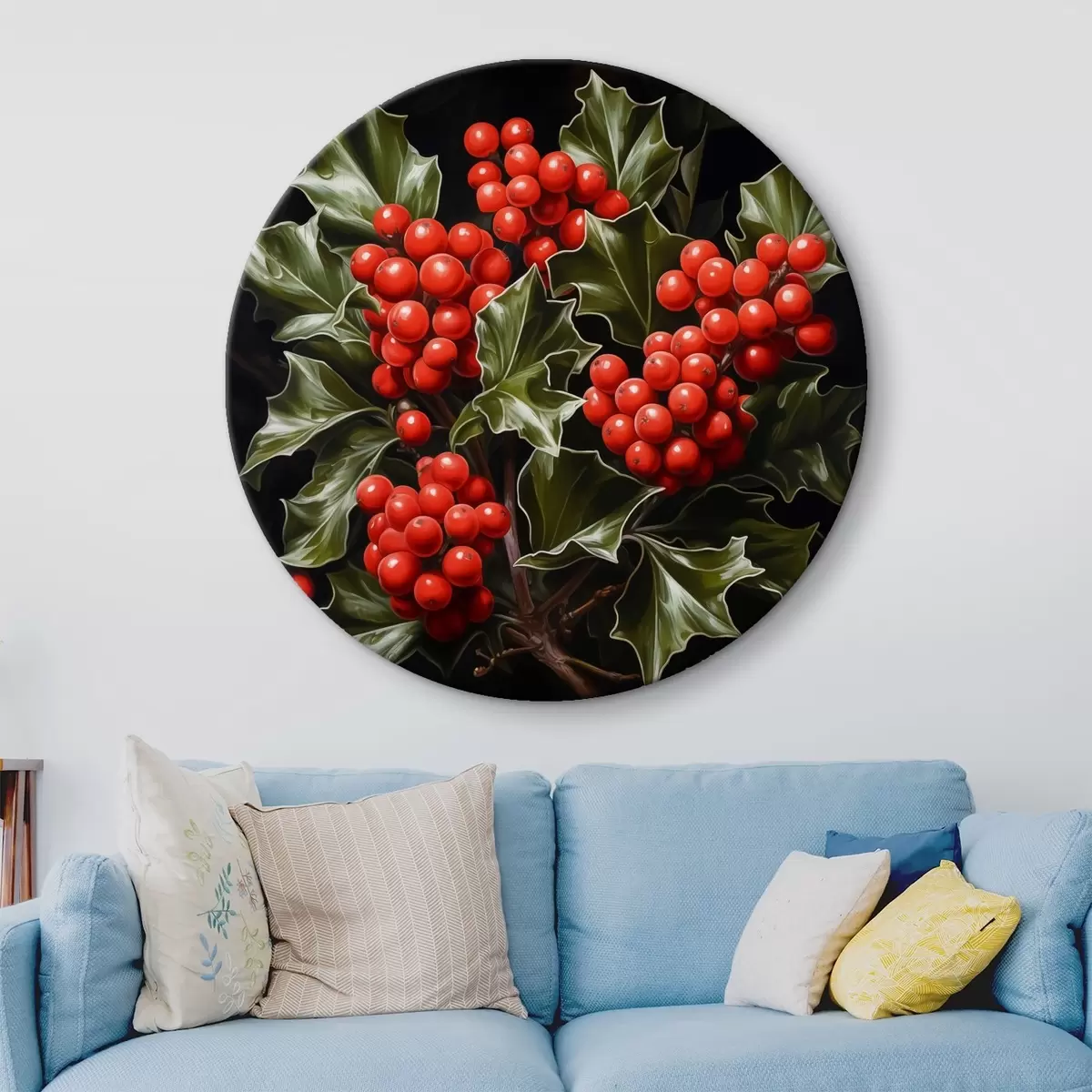 Okrągły obraz Jagody i liście ostrokrzewu na ciemnym tle Nr r41273