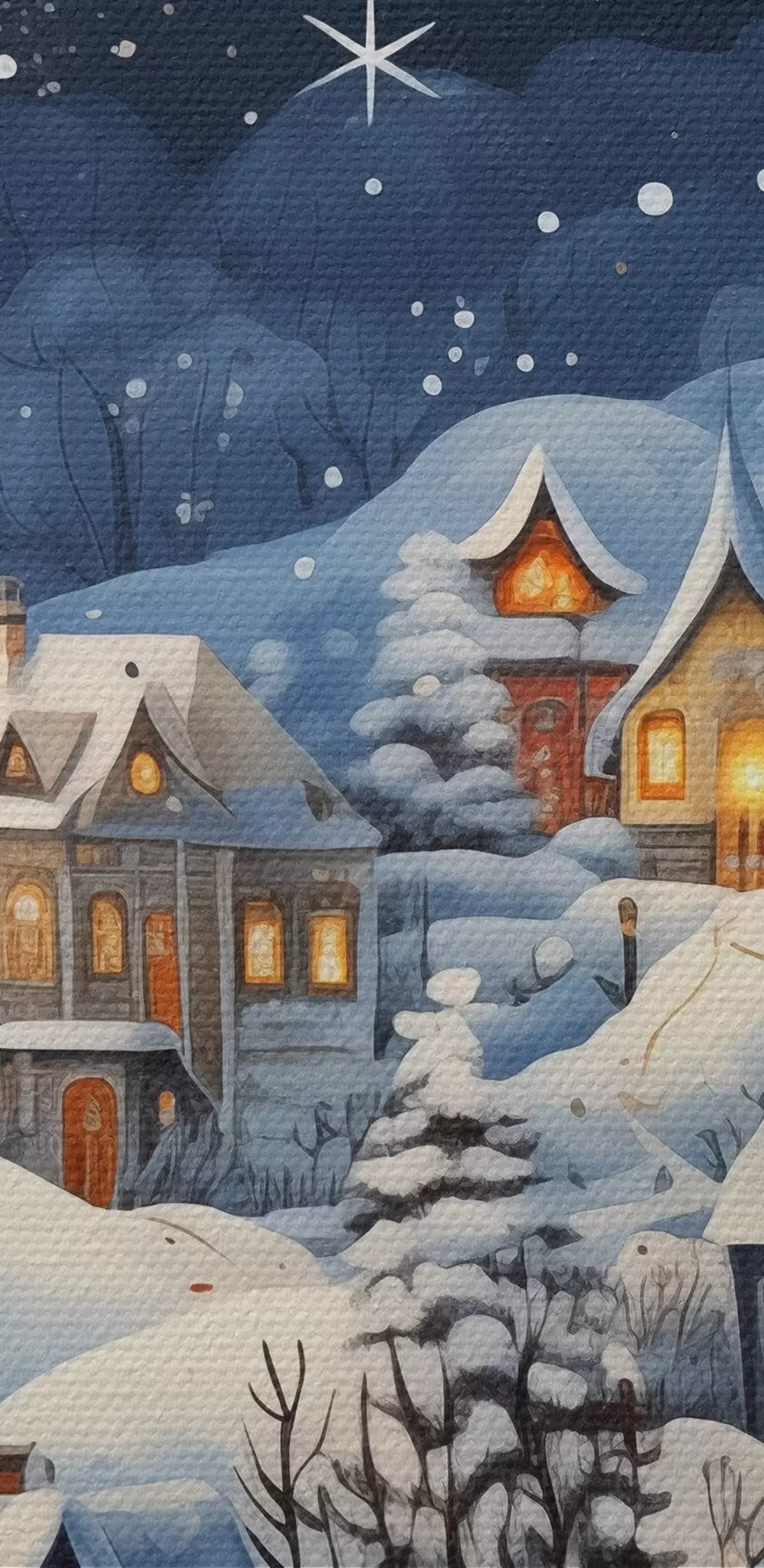 Okrągły obraz Zimowy krajobraz z ośnieżonymi wiejskimi domami na tle rozgwieżdżonego nocnego nieba Nr r41275