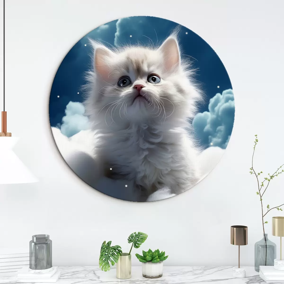 Okrągłe obrazy Biały puszysty kotek na niebie siedzi na chmurze r41279