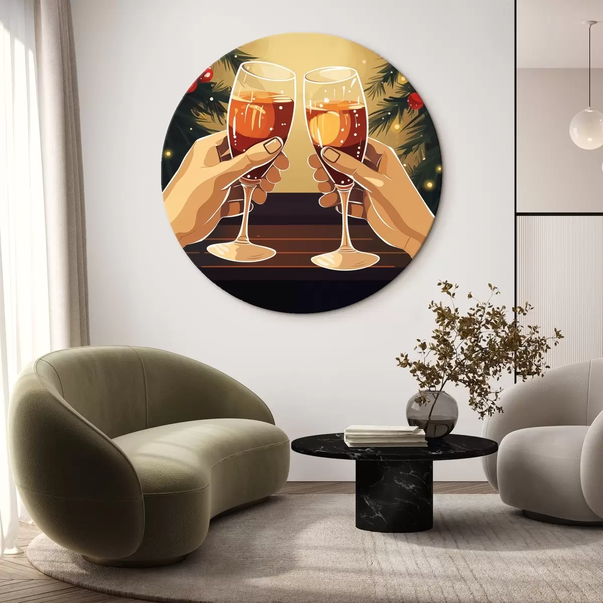 Okrągły obraz Kieliszki do szampana, świętowanie, Nowy Rok, lampki choinkowe Nr r41372