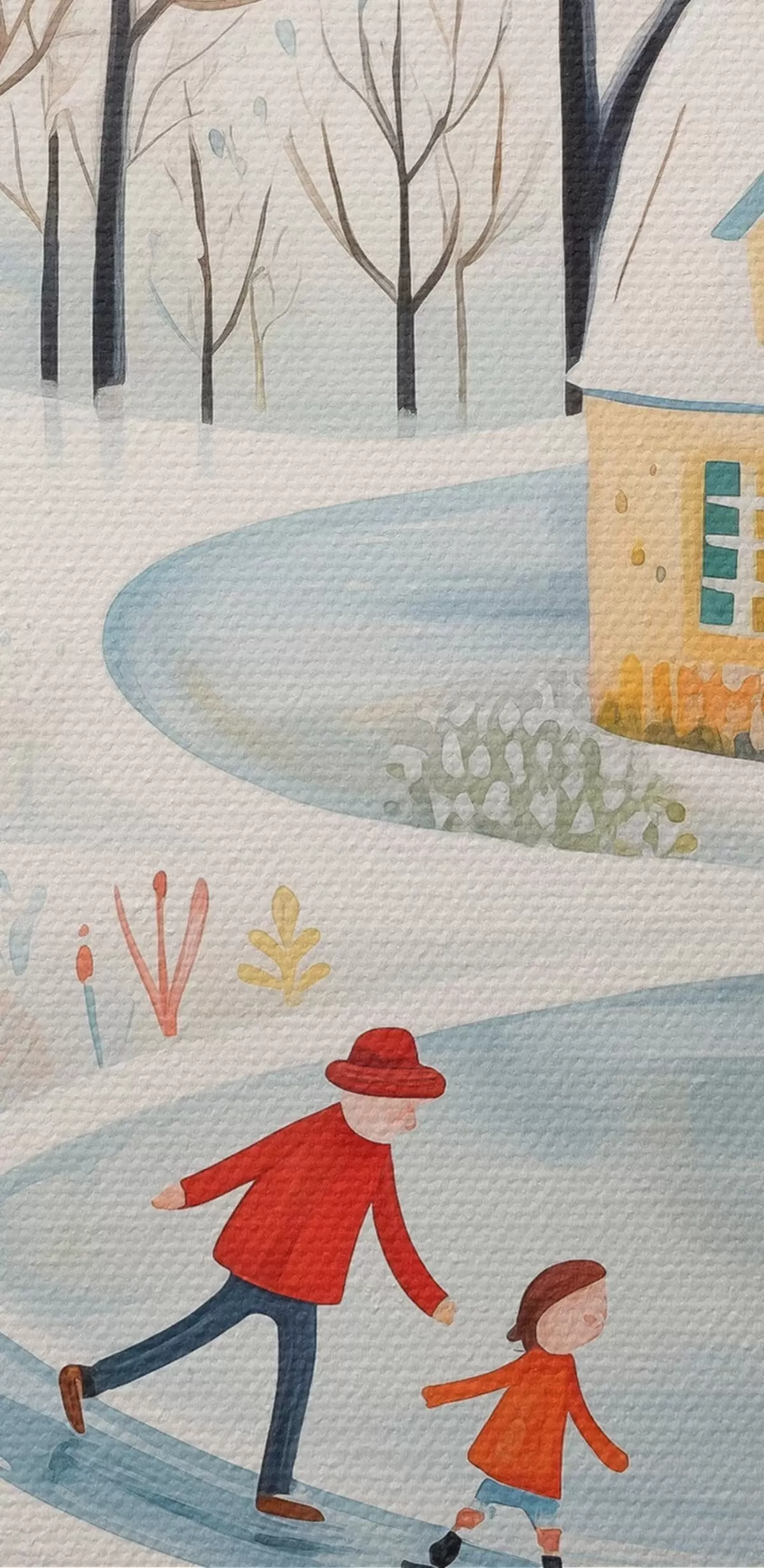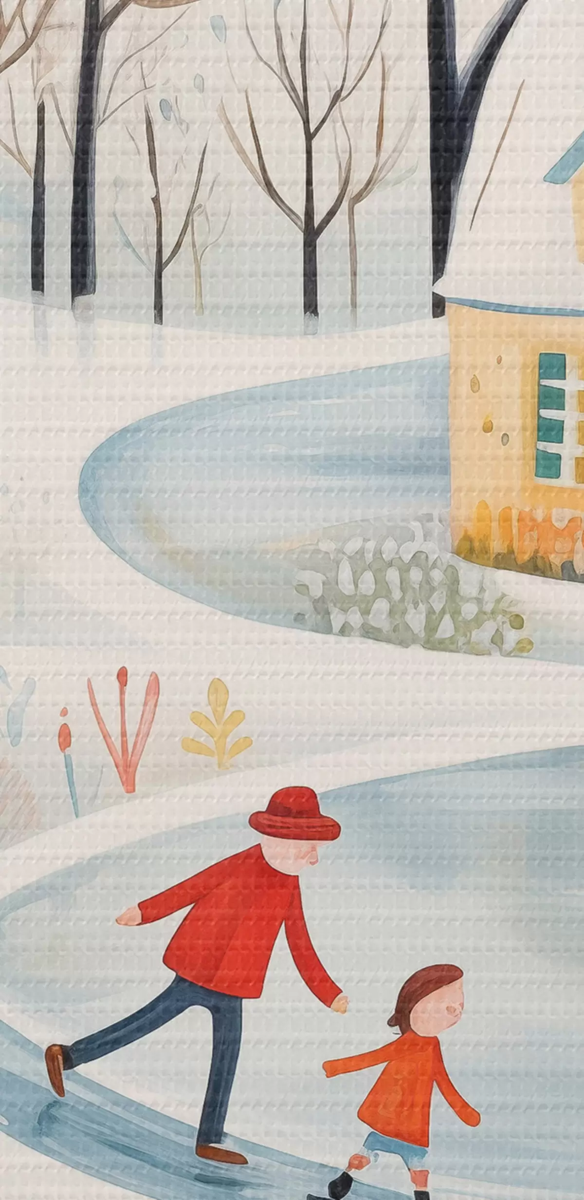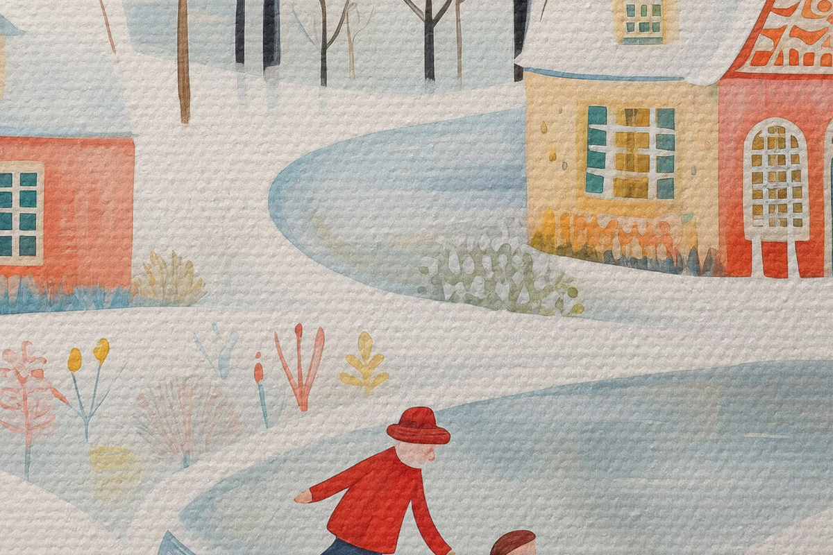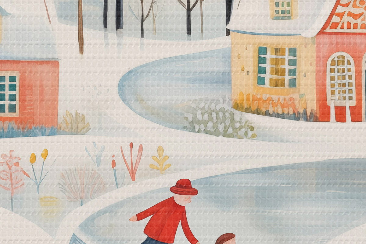 Okrągły obraz Zimowa wioska, las, kwiaty, łyżwy, kolorowe domy Nr r41378