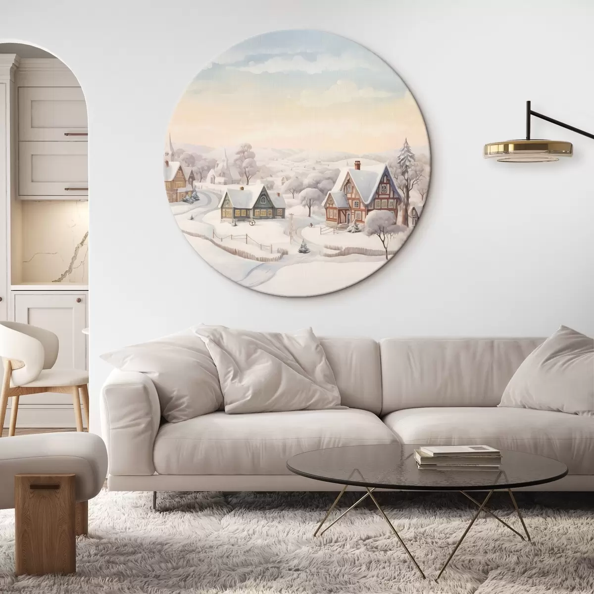 Okrągłe obrazy Piękny zimowy krajobraz z wioską, drzewami, domami, akwarela r41379