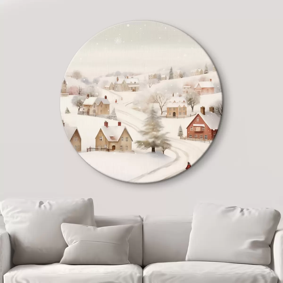 Okrągłe obrazy Zimowa wioska, akwarela, płatki śniegu, delikatne kolory, drzewa, krajobraz r41381