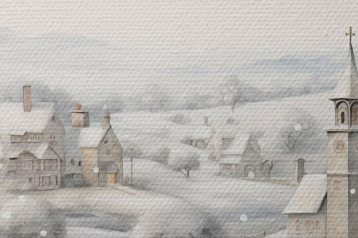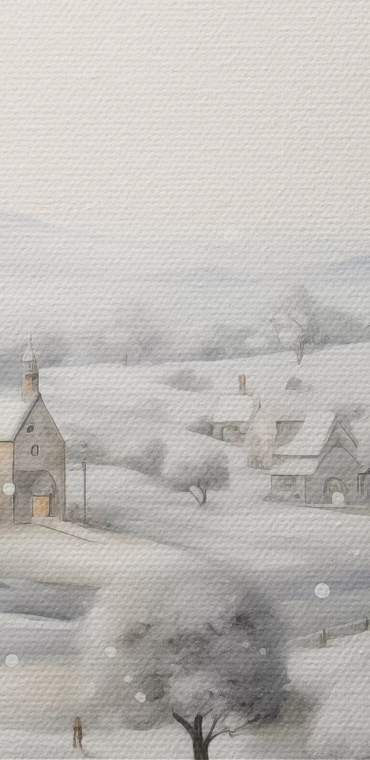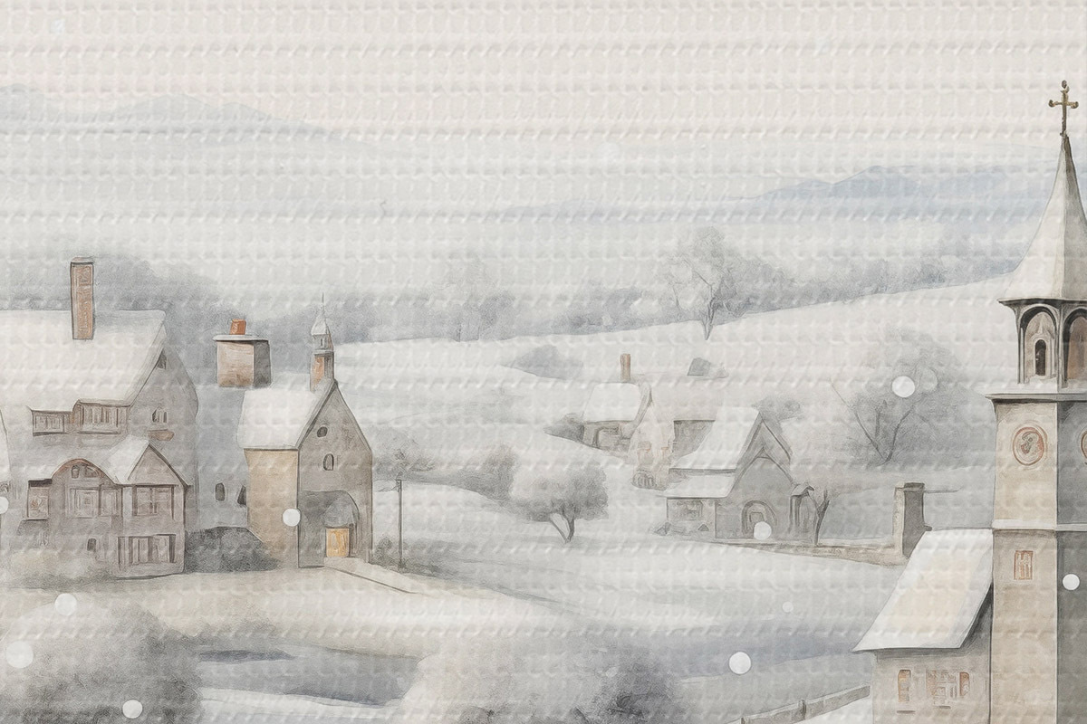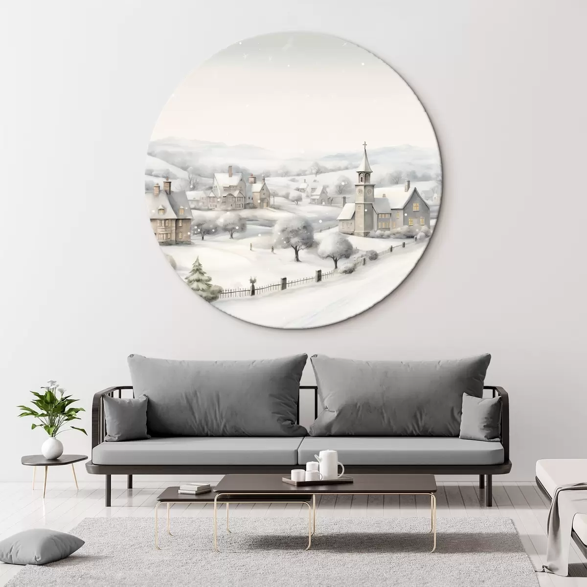 Okrągły obraz Piękna zimowa wioska, drzewa, domy, akwarela, góry Nr r41382