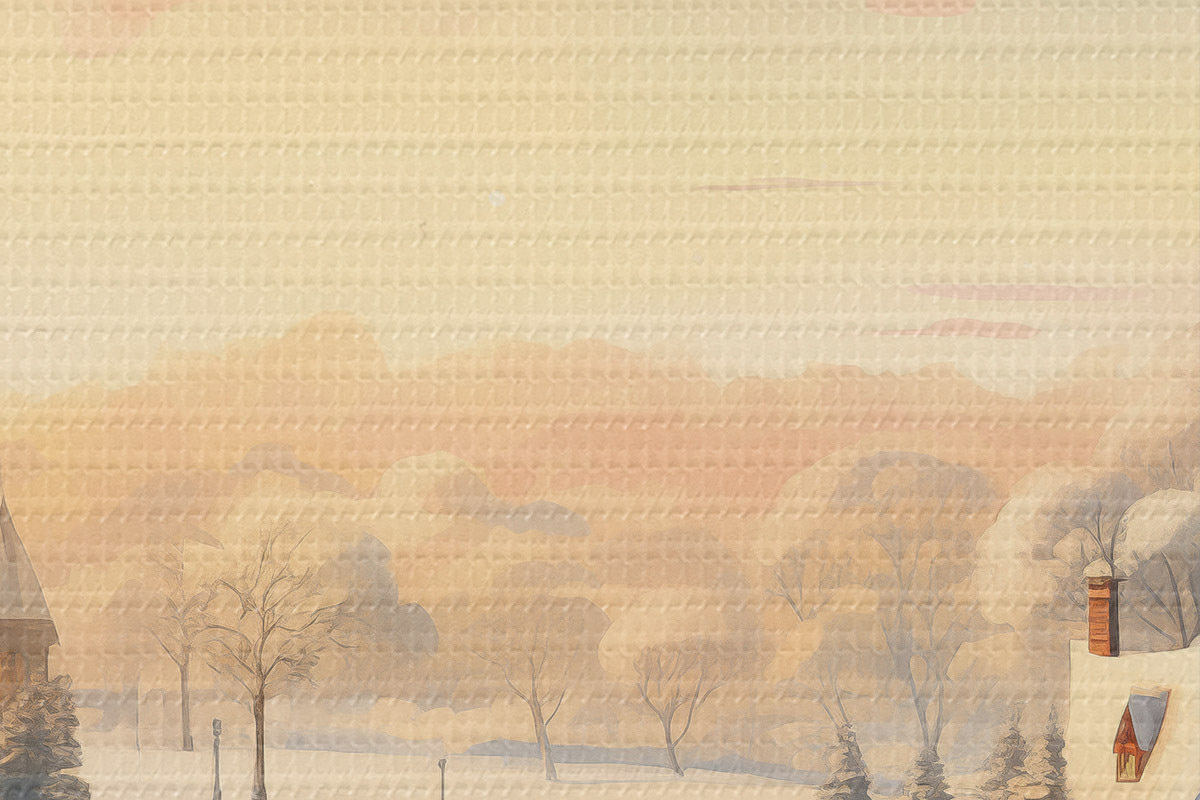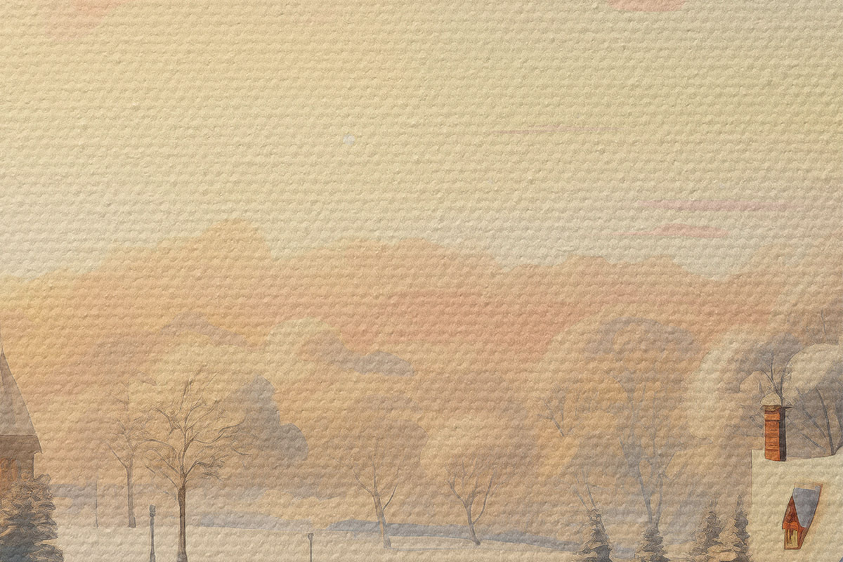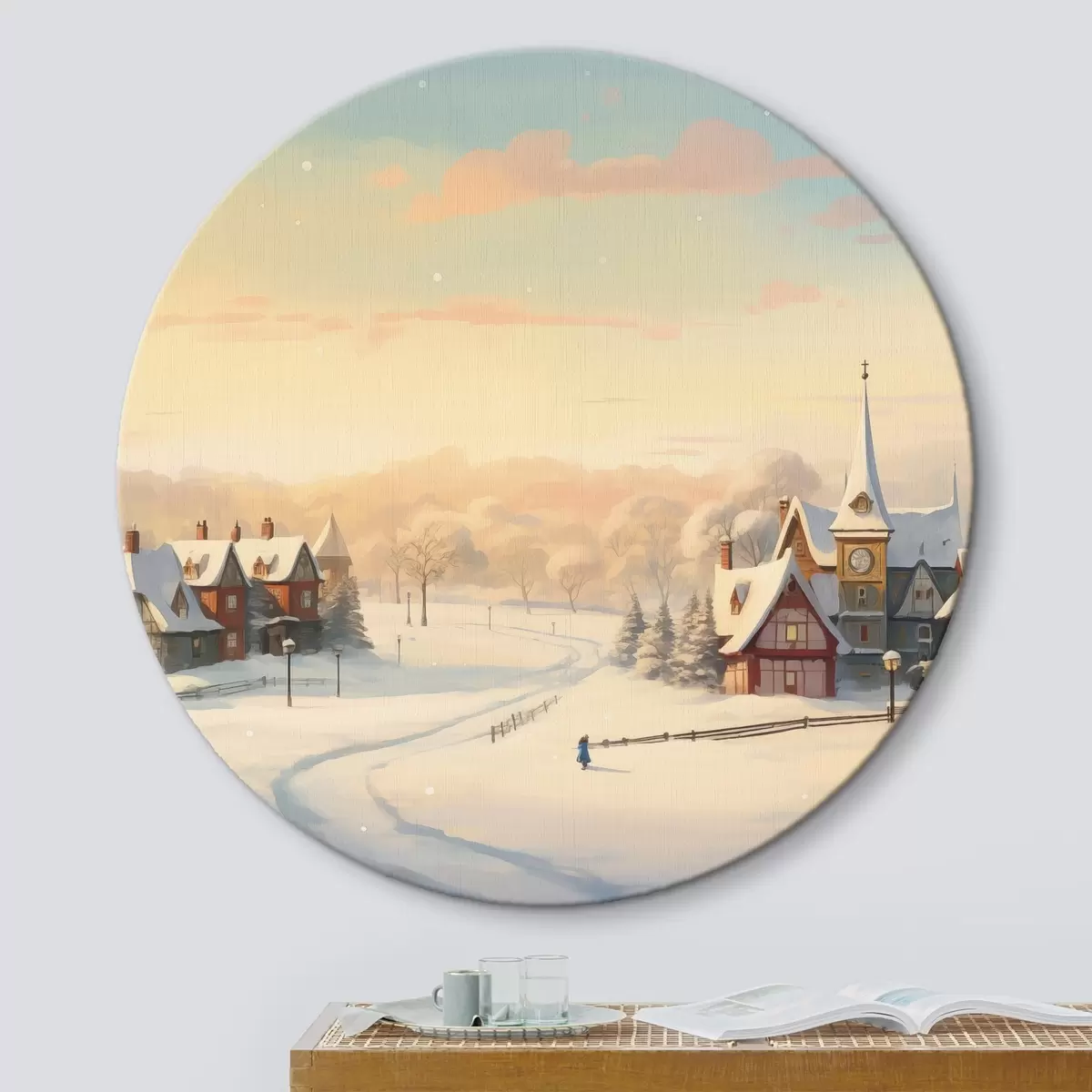 Okrągły obraz Zimowa kraina czarów, domy, niebo o zachodzie słońca, drzewa, akwarela Nr r41383