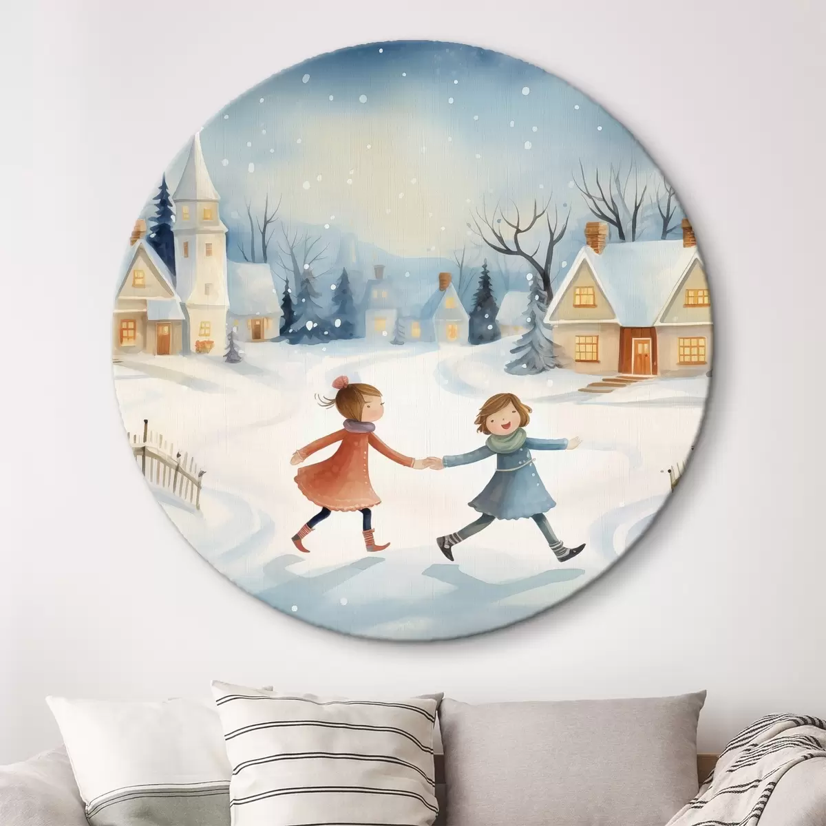 Okrągły obraz Dziewczyny w zimowej wiosce, płatki śniegu, akwarela, domy, las Nr r41385