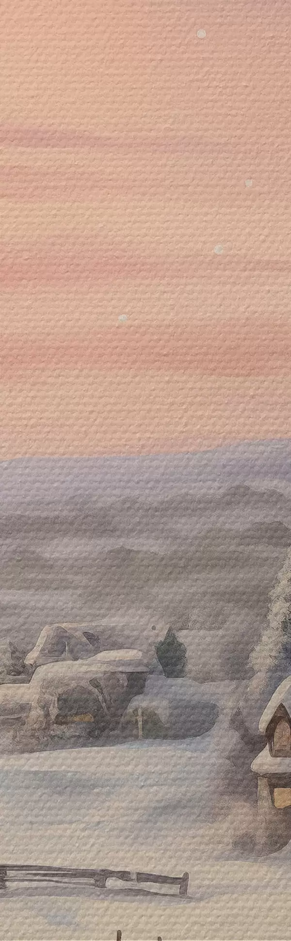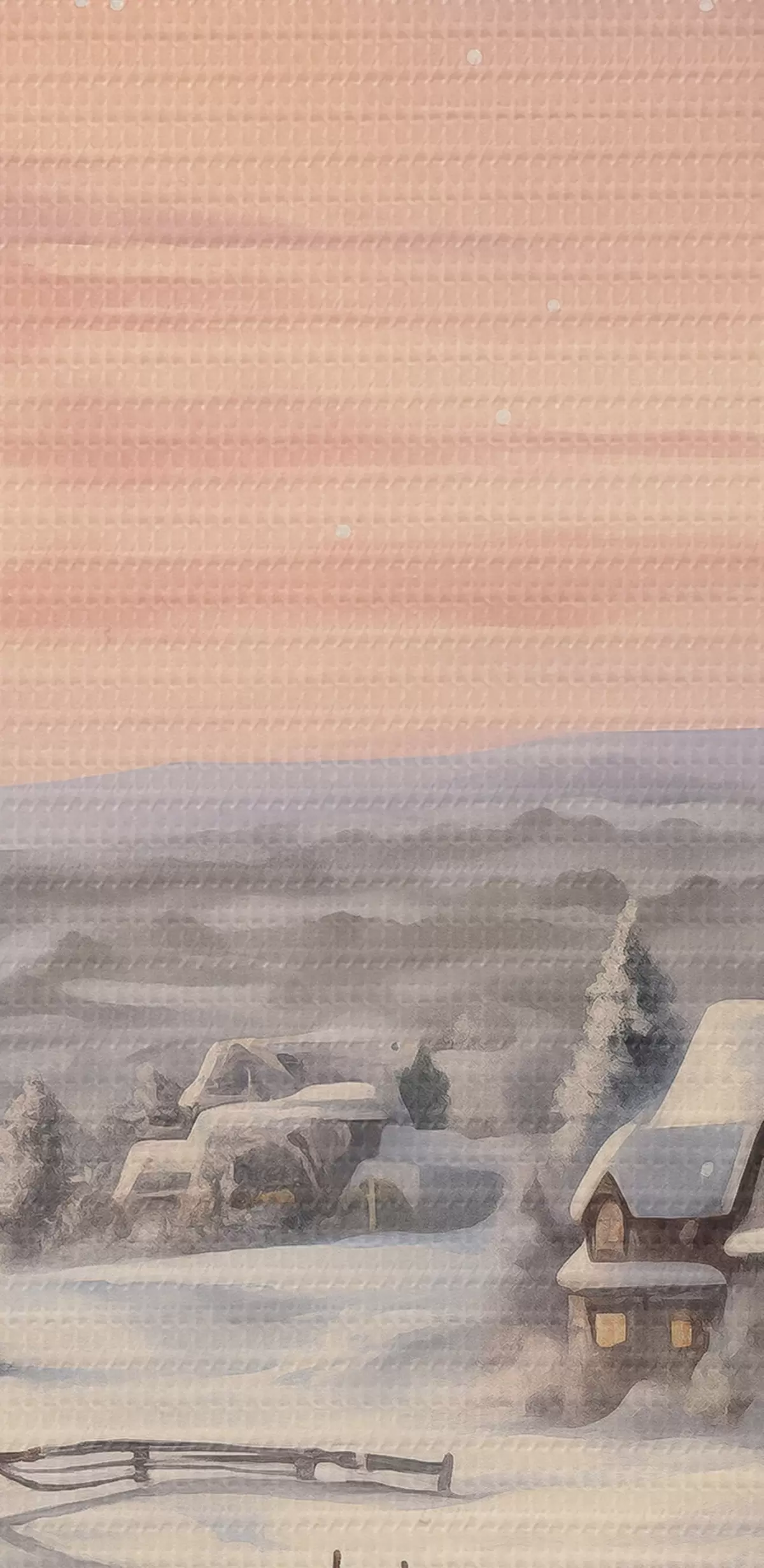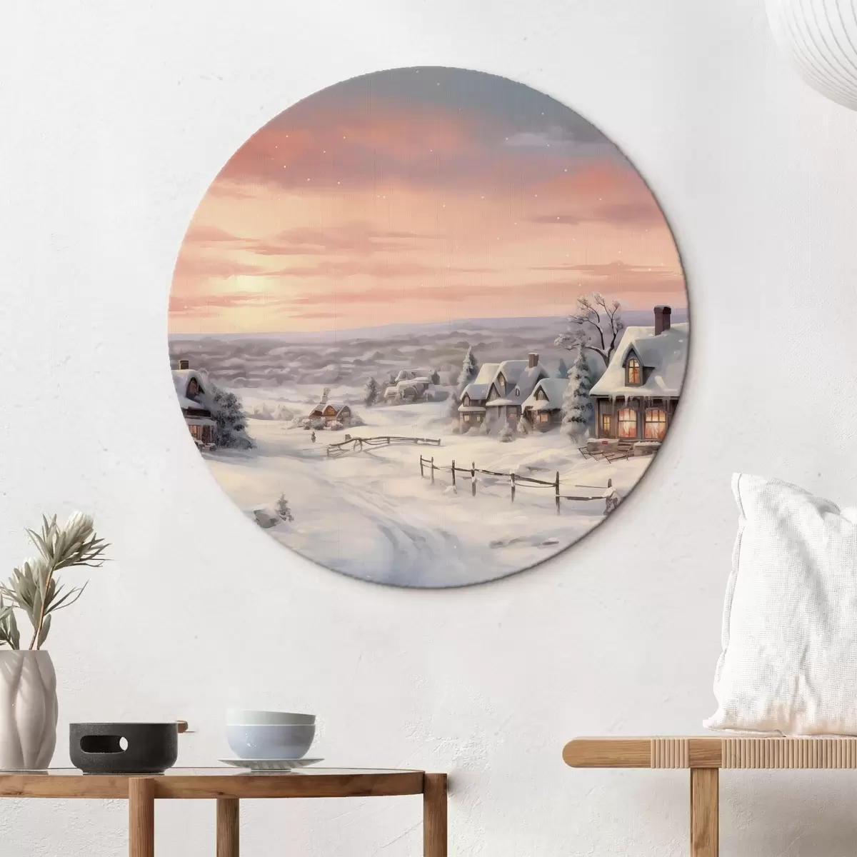 Okrągły obraz Zachód słońca w zimowej wiosce, rustykalny, akwarela, płatki śniegu Nr r41386