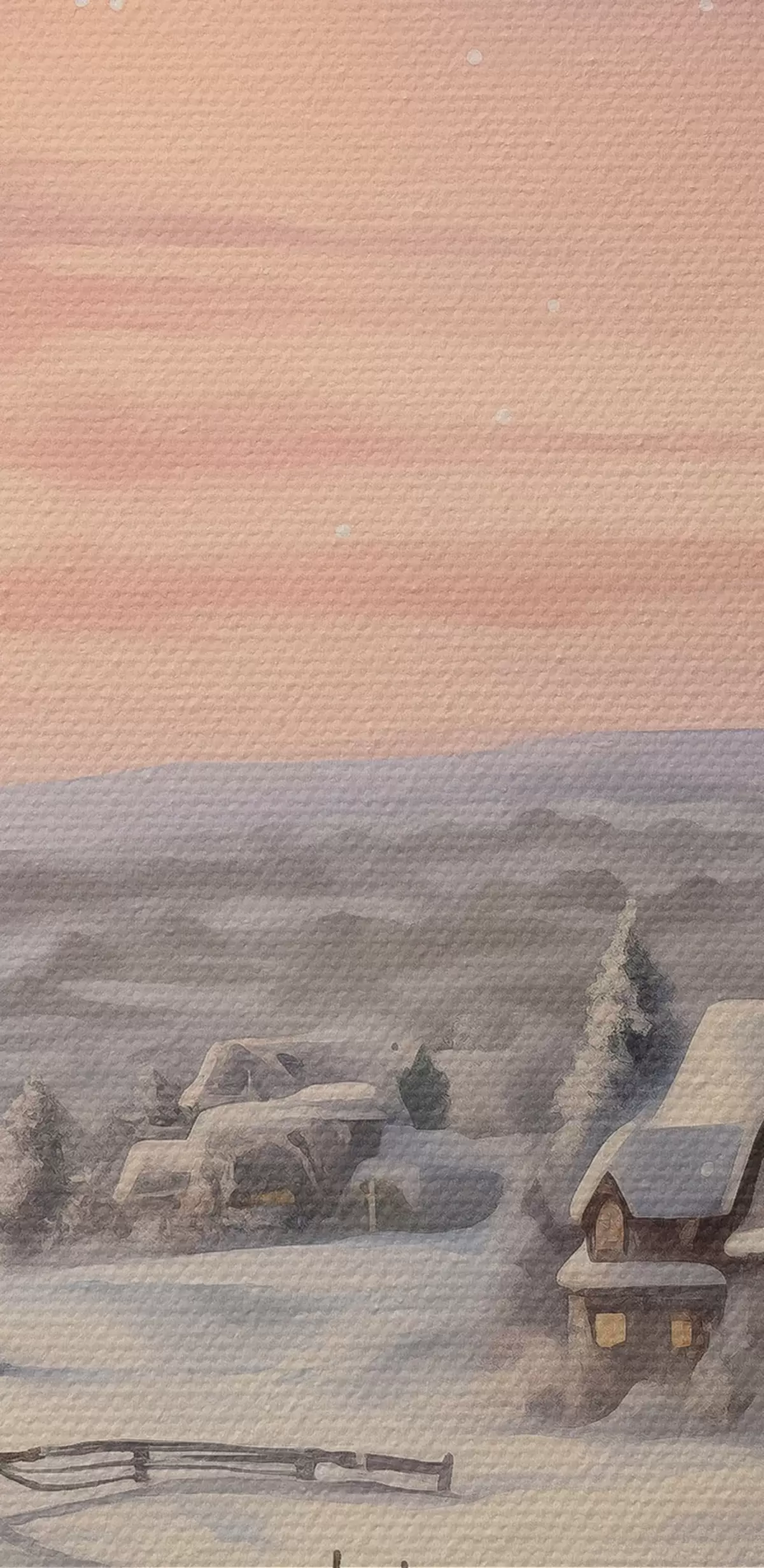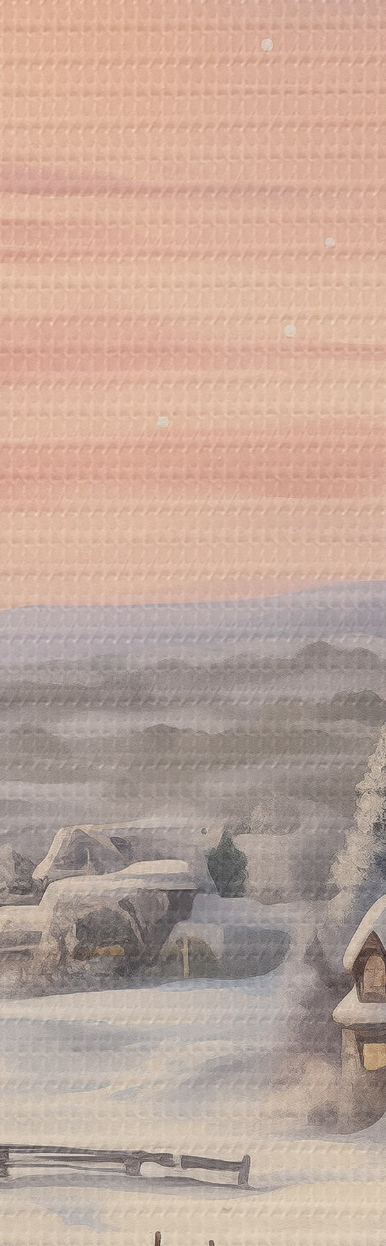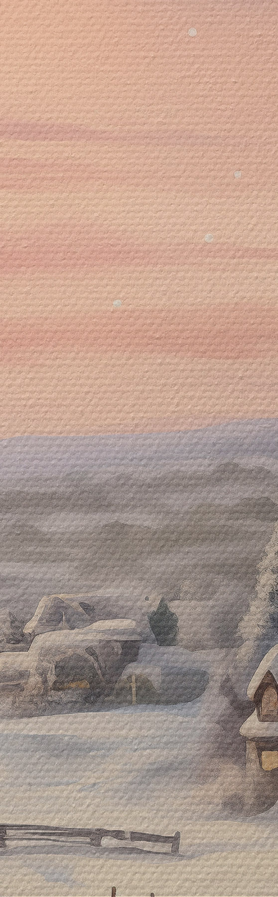 Okrągły obraz Zachód słońca w zimowej wiosce, rustykalny, akwarela, płatki śniegu Nr r41386