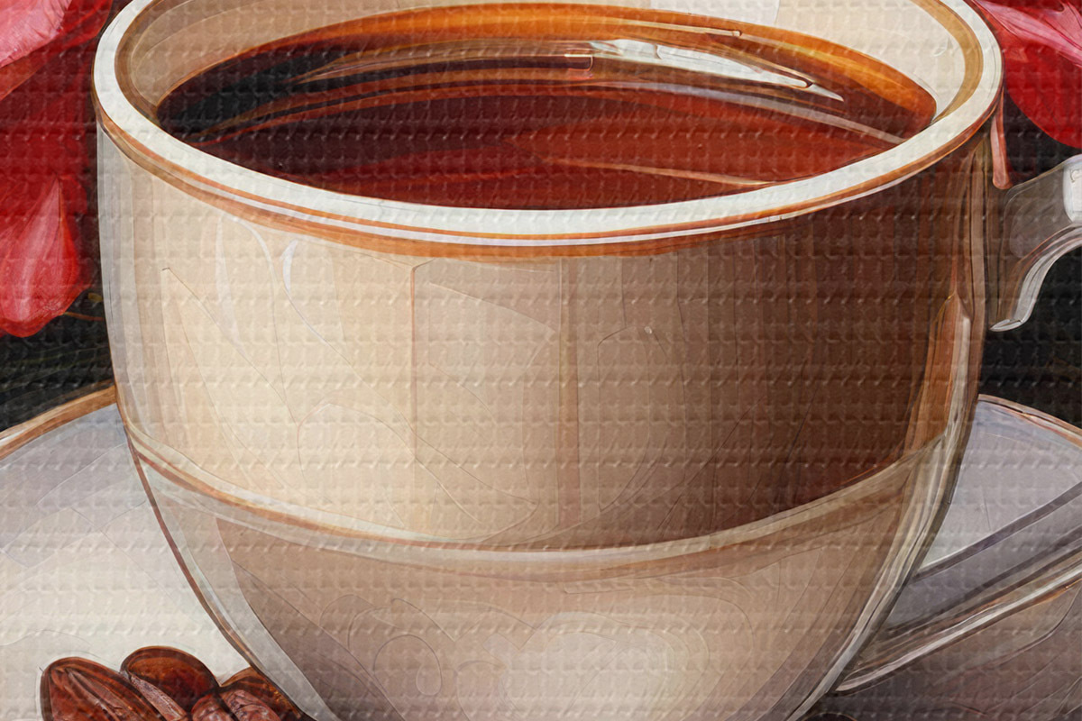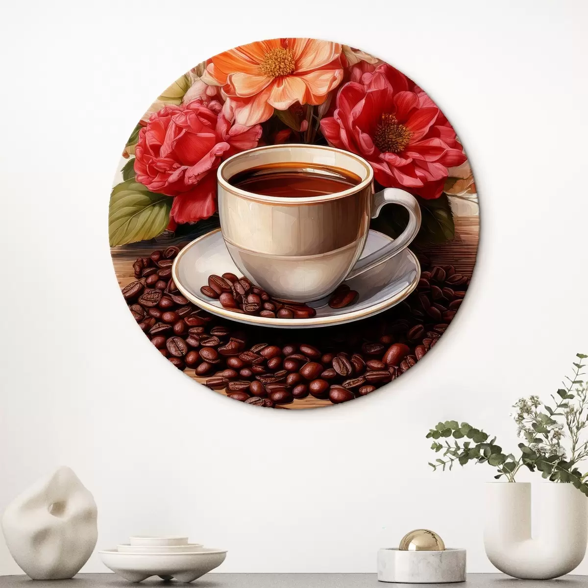 Okrągły obraz filiżankę kawy i bukiet kwiatów Nr r41411