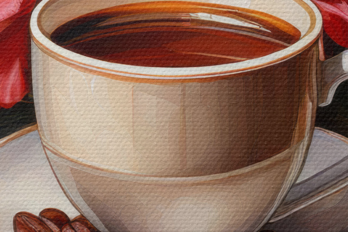 Okrągłe obrazy filiżankę kawy i bukiet kwiatów r41411
