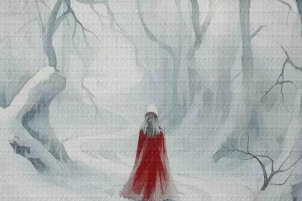 Okrągły obraz Mężczyzna w czerwonym płaszczu w środku zimowego lasu Nr r41438