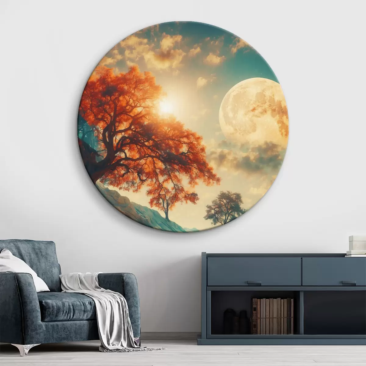Okrągły obraz Drzewa i góry na tle ogromnego księżyca Nr r41774