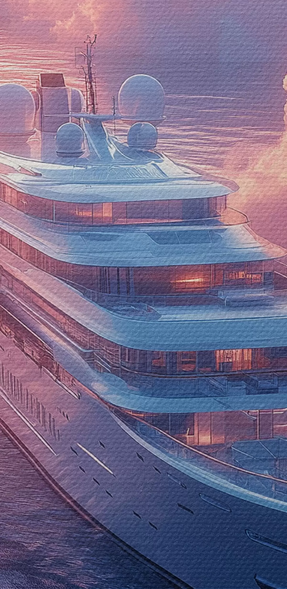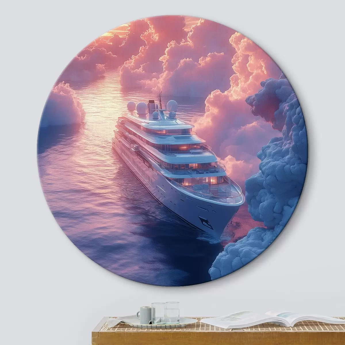 Okrągły obraz Statek wycieczkowy na różowym tle zachodu słońca Nr r42085
