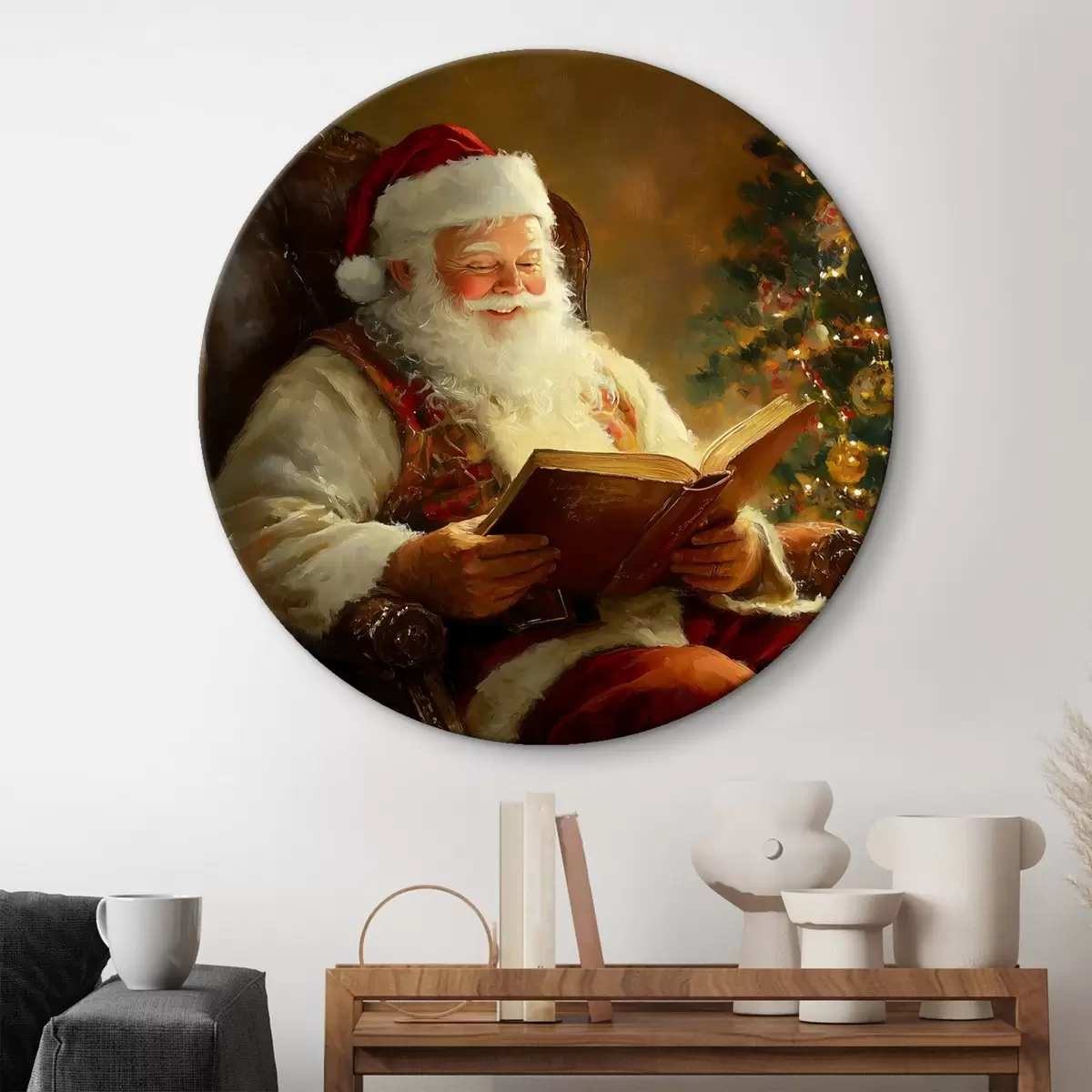 Okrągłe obrazy Święty Mikołaj czyta książkę w pobliżu choinki r42100