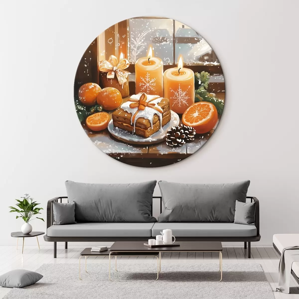 Okrągły obraz Ciasto świąteczne, mandarynki, świeczki Nr r42101