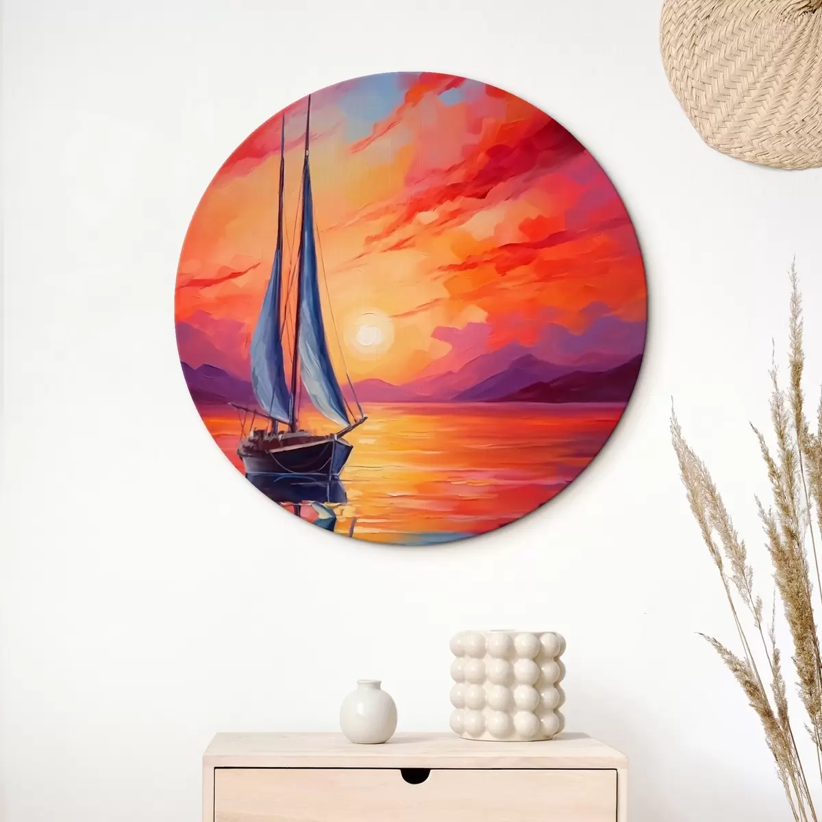 Okrągły obraz Żaglówka na tle jasnego zachodu słońca Nr r42151