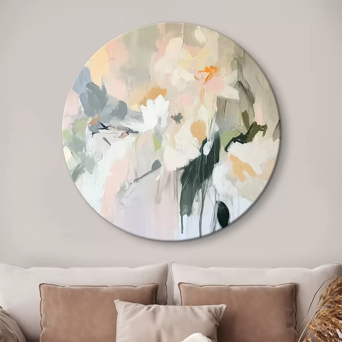 Okrągły obraz Rysunek abstrakcyjny, styl akrylowy, miękkie naturalne kolory Nr r42204