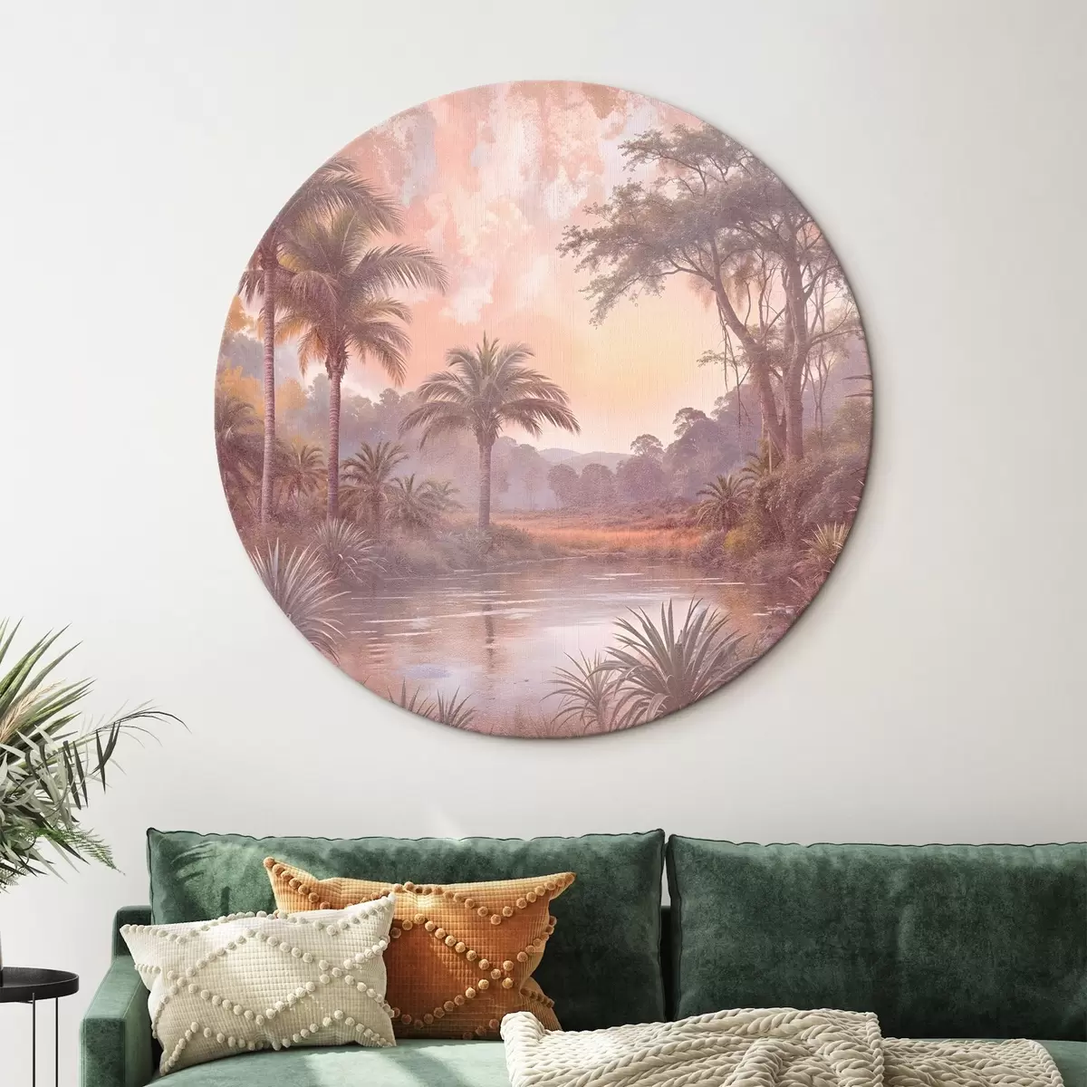 Okrągły obraz Tropikalny krajobraz ze spokojnym jeziorem otoczonym bujnymi palmami i innymi liśćmi Nr r42219