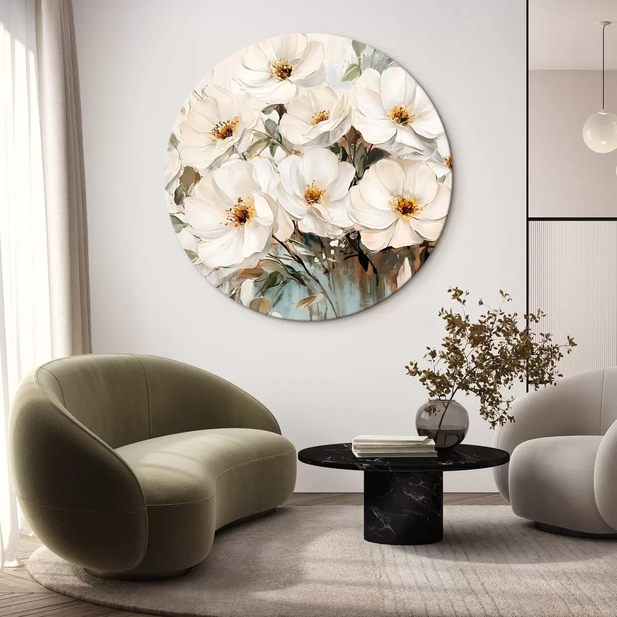 Okrągły obraz Bukiet dużych białych kwiatów w stylu malarstwa olejnego z żółtymi środkami na jasnym tle Nr r42222
