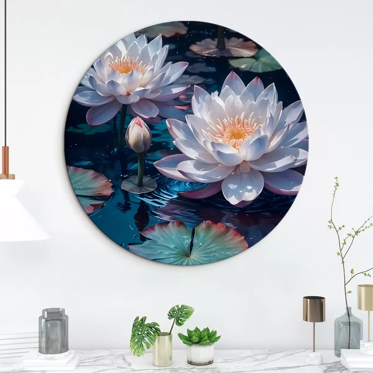 Okrągły obraz Białe kwiaty lotosu unoszące się na spokojnym stawie z płatkami lilii Nr r42225