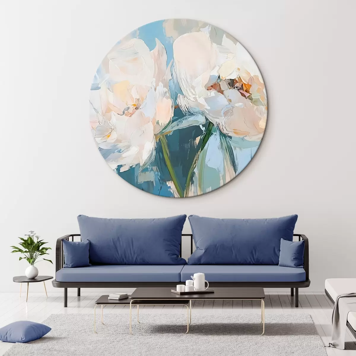 Okrągły obraz Biały minimalistyczny abstrakcyjny obraz olejny imitujący piwonie na miękkim niebieskim tle Nr r42226