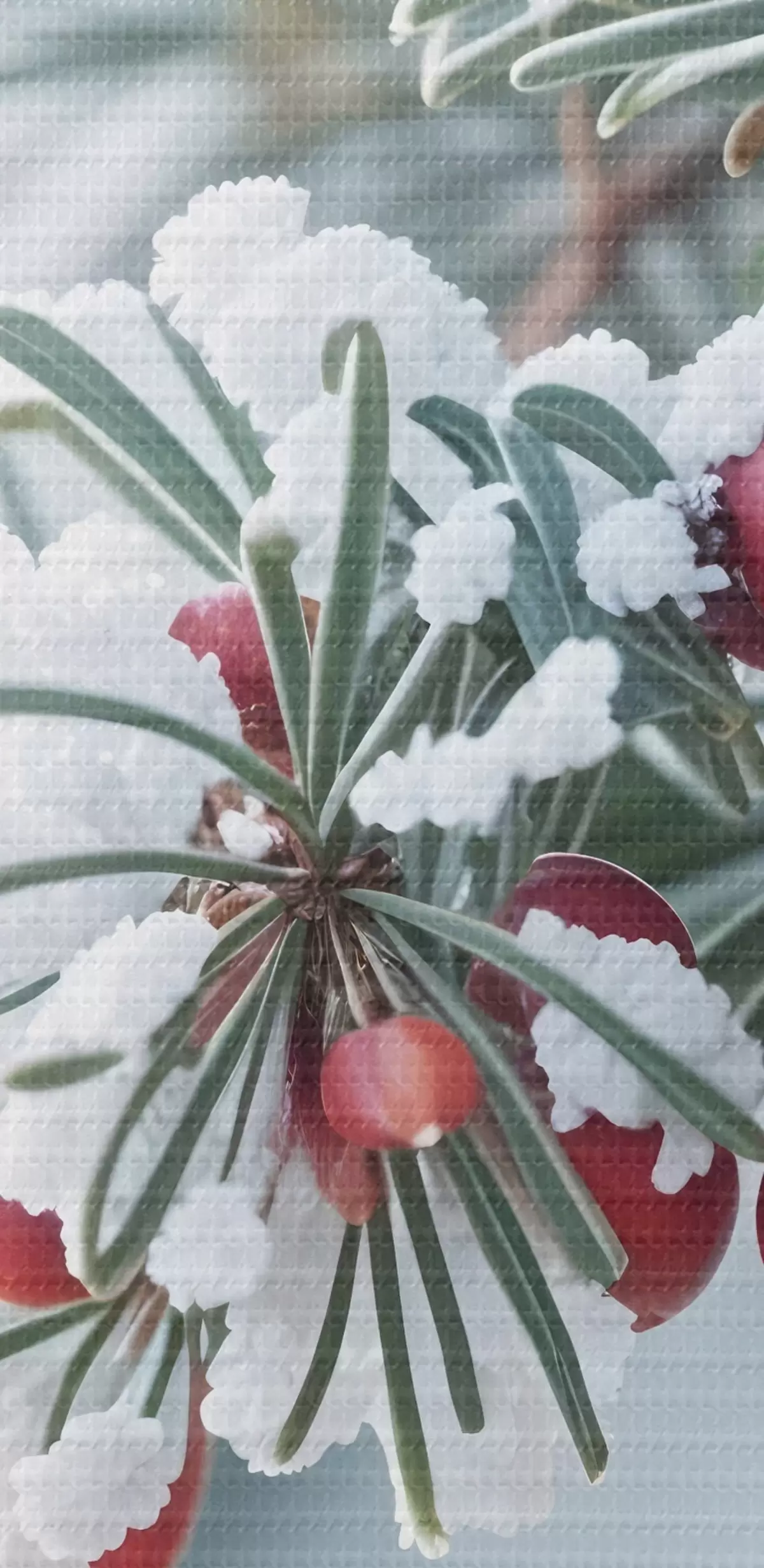 Okrągły obraz Ośnieżona gałąź sosny z czerwonymi jagodami, scena zimowa Nr r42238