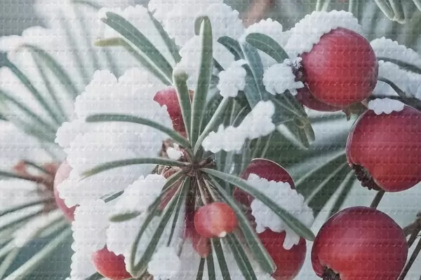 Okrągły obraz Ośnieżona gałąź sosny z czerwonymi jagodami, scena zimowa Nr r42238