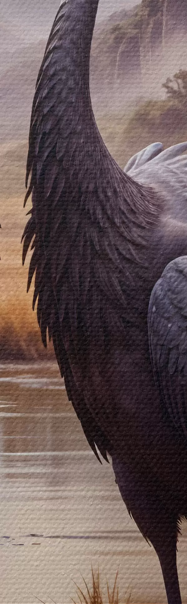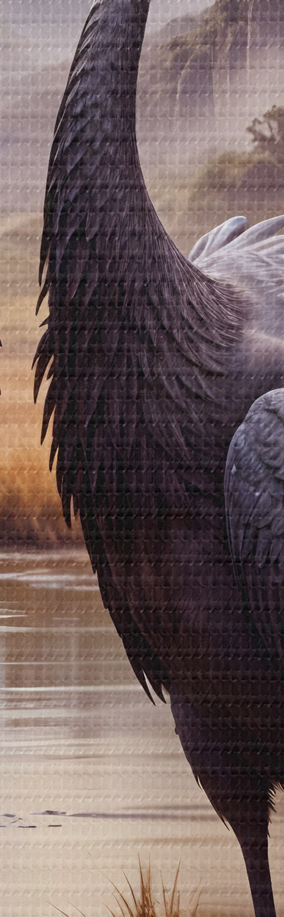 Okrągły obraz Dwa duże czarne żurawie stojące w płytkim stawie, z górskim krajobrazem w tle Nr r42240