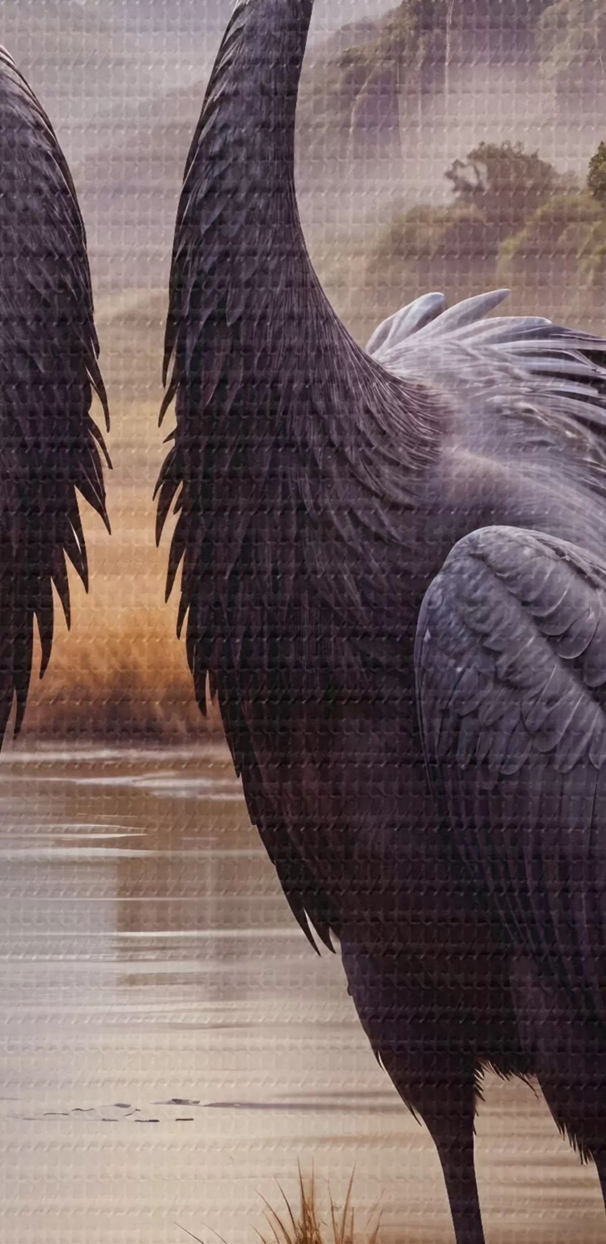 Okrągły obraz Dwa duże czarne żurawie stojące w płytkim stawie, z górskim krajobrazem w tle Nr r42240