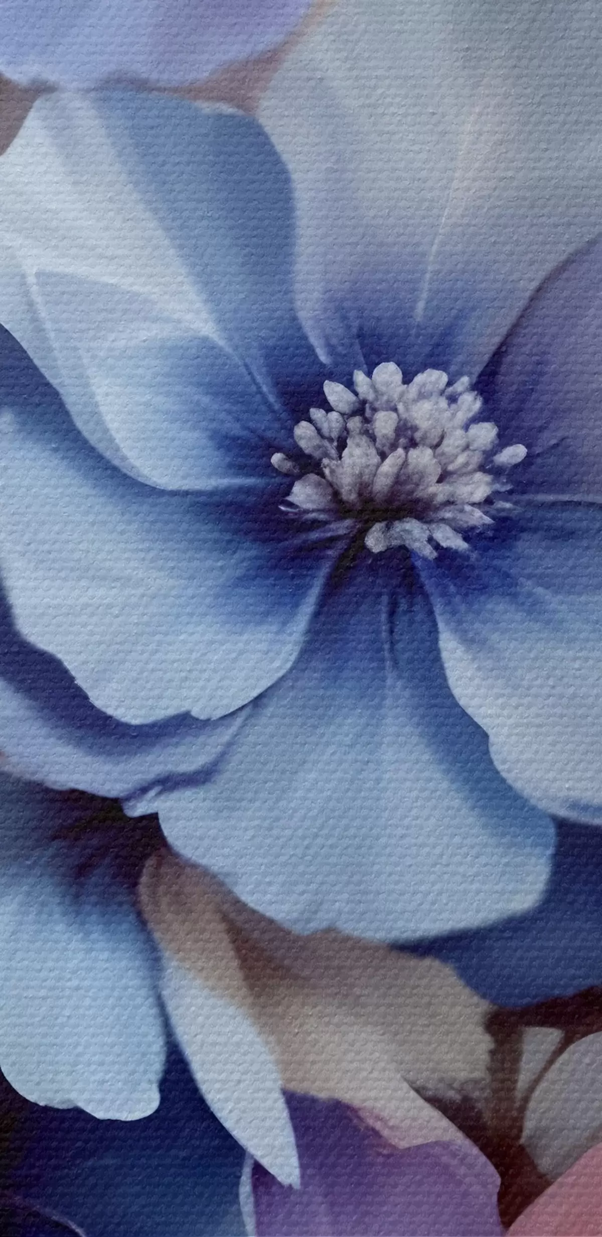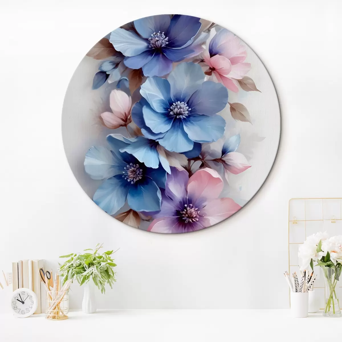 Okrągły obraz Delikatne niebieskie i różowe kwiaty z miękkimi płatkami i środkami, ułożone w piękny kwiatowy nadruk na jasnym tle Nr r42241