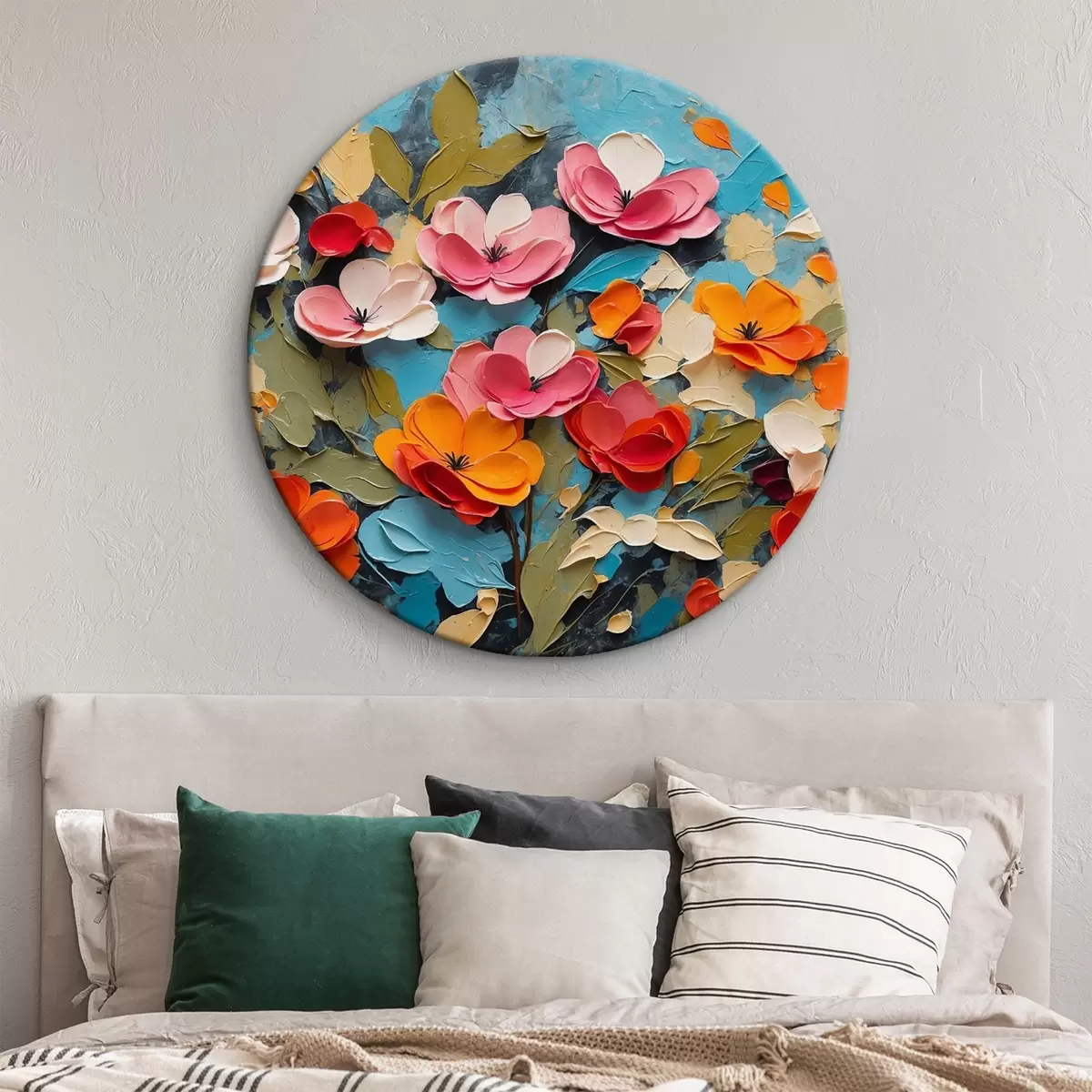 Okrągły obraz Kwiaty i liście na niebieskim tle Nr r42255