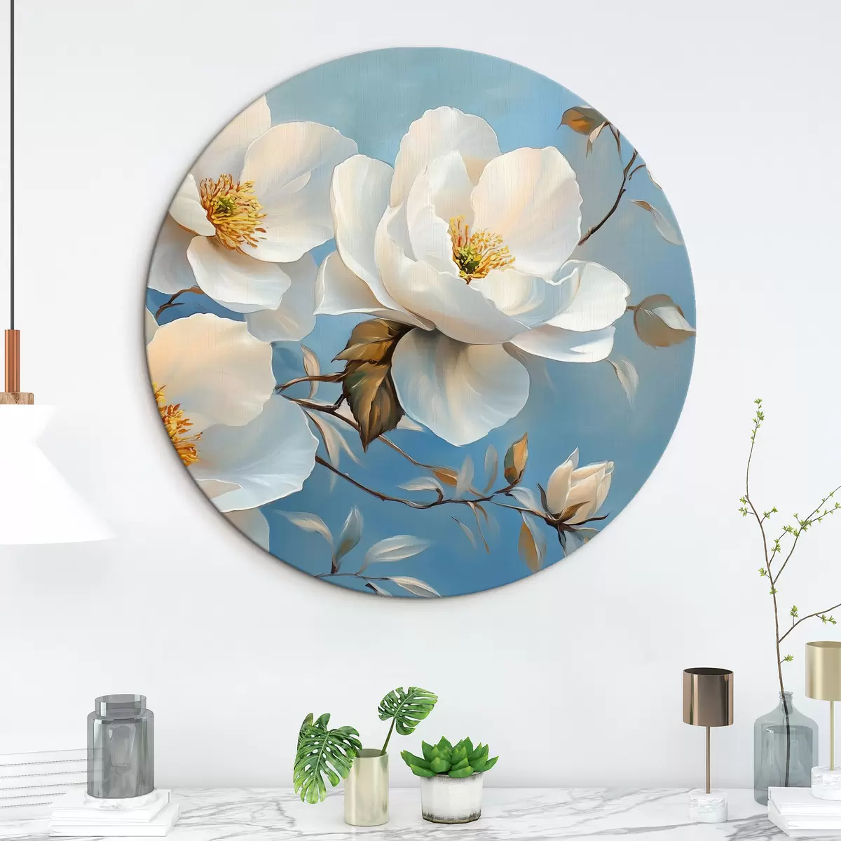Okrągłe obrazy Duże białe kwiaty na niebieskim tle r42321