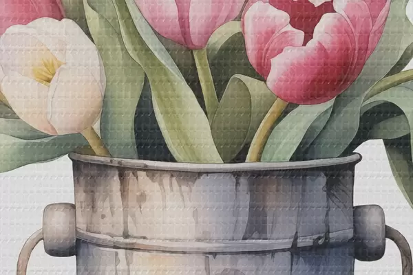 Okrągły obraz Bukiet tulipanów w wiadrze imitującym akwarelę Nr r42353