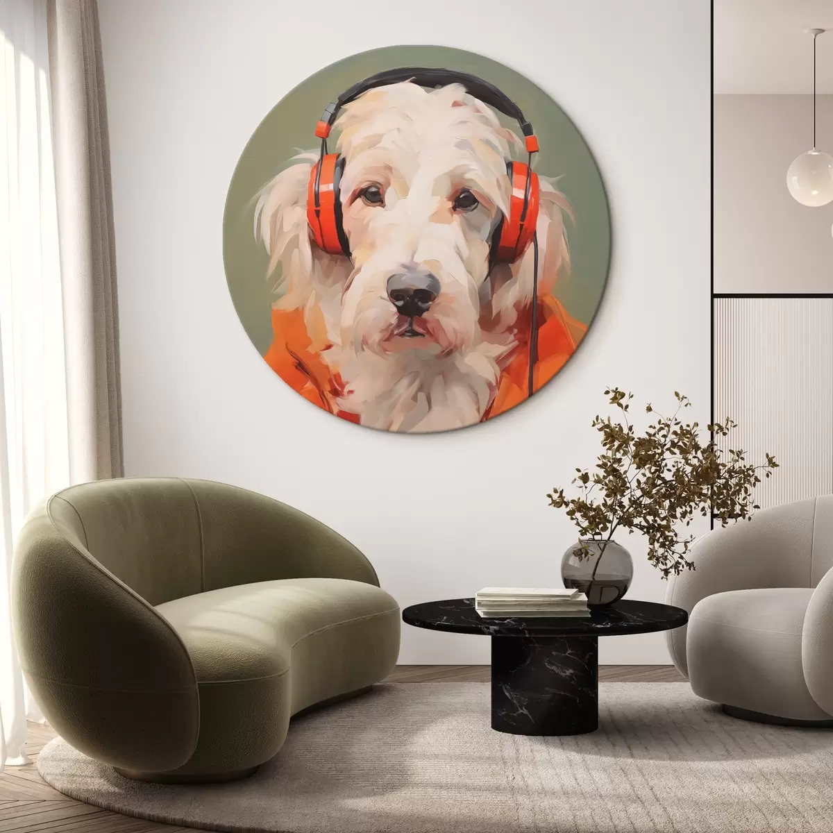 Okrągły obraz Biały pies z pomarańczową kurtką i słuchawkami imitującymi obraz Nr r42364